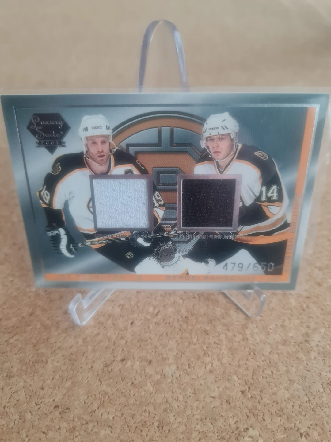 This is a 2003 Upper Deck Luxury Suite jersey card featuring Boston Bruins players Patrice Bergeron and Tuukka Rask. It's card number 479 out of 650. Features authentic game-worn jersey pieces.