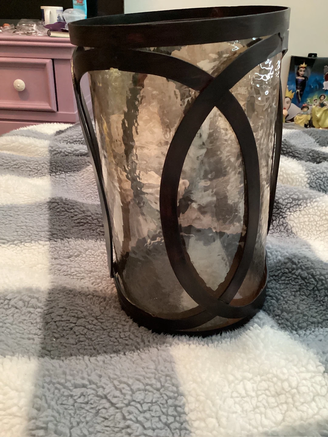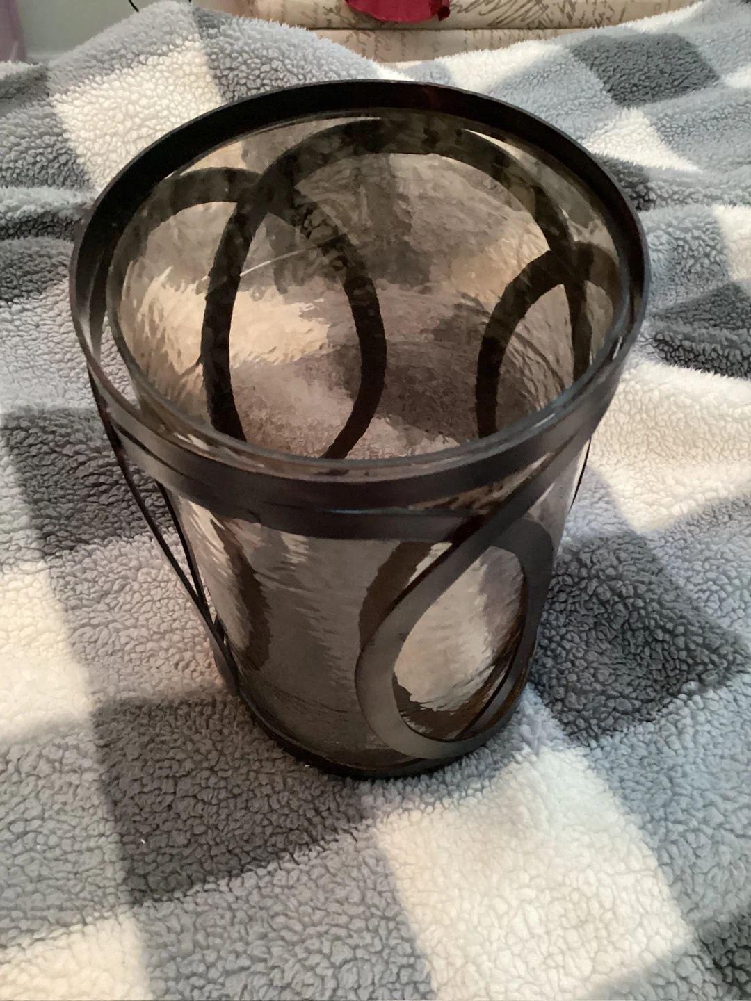 This decorative lantern features a hammered glass cylinder with a dark metal frame. It's designed with a unique crisscross pattern on the sides. It could hold a pillar candle or serve as a stylish accent piece. Smoke and pet free home Approx 11” x 6.5”
