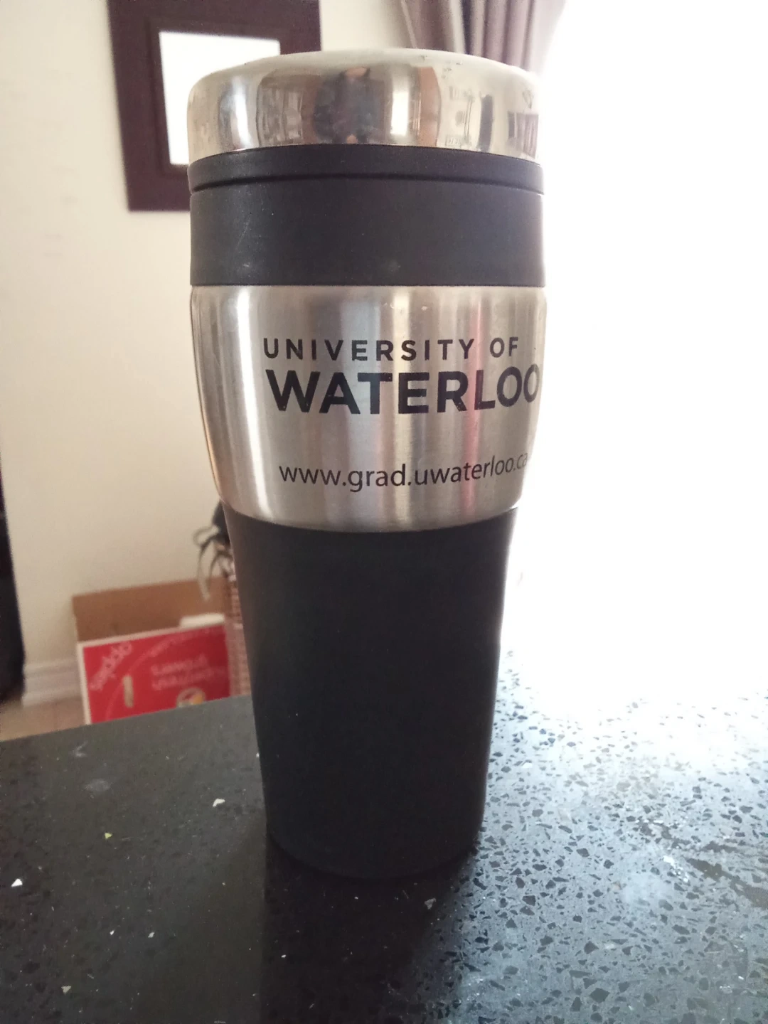 This is a reusable travel mug with the University of Waterloo logo. It's made of stainless steel and has a black, non-slip grip. The lid screws on securely.