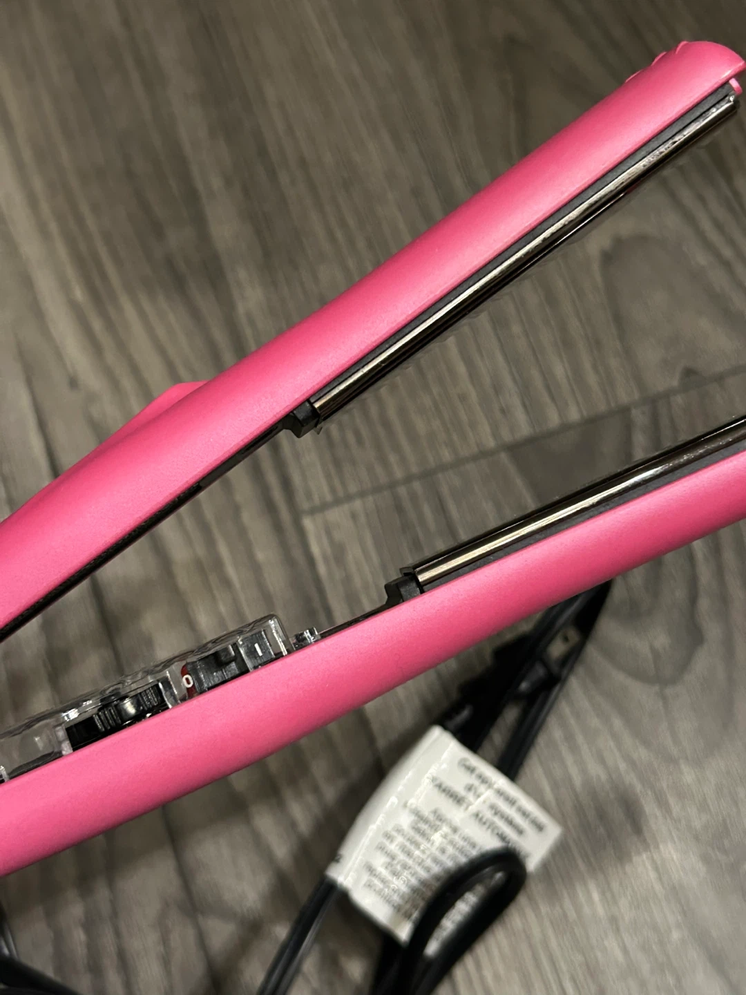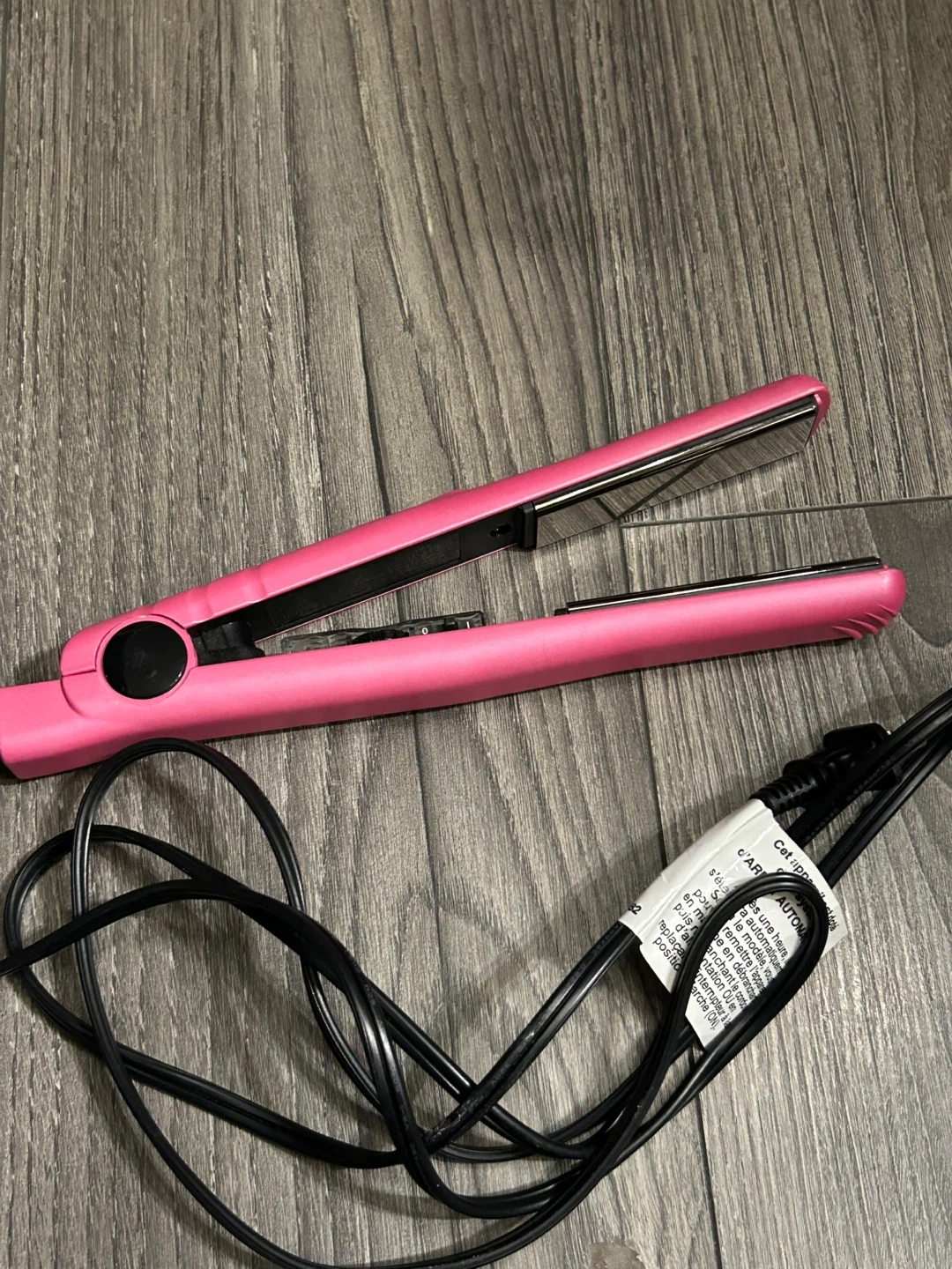 This is a Revlon pink hair straightener. It has ceramic plates and adjustable temperature settings. Perfect for achieving smooth, straight hair quickly!