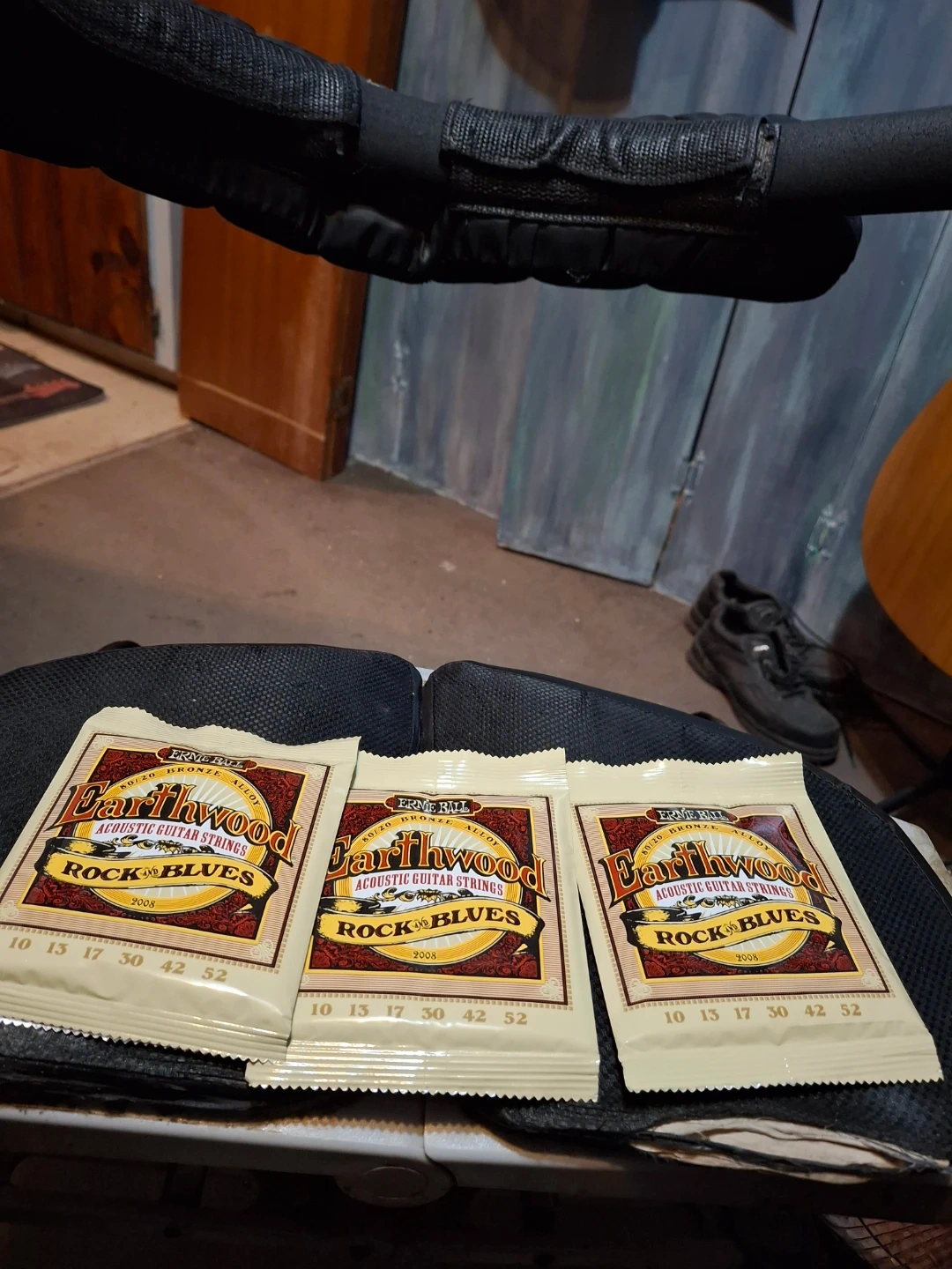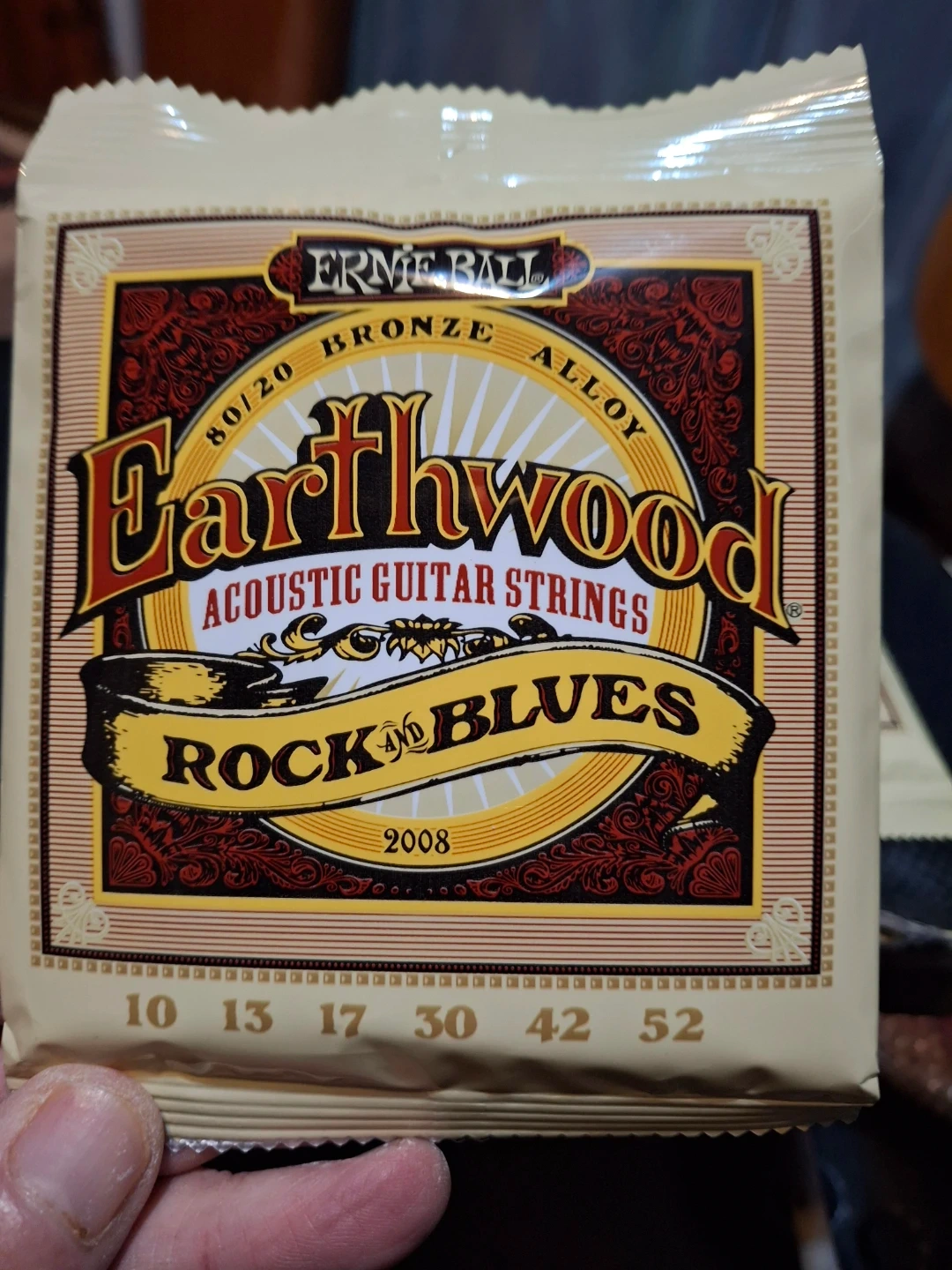 These are Ernie Ball Earthwood acoustic guitar strings. They're the Rock & Blues set, made with 80/20 Bronze Alloy. Gauges included are 10, 13, 17, 30, 42, and 52. Perfect for acoustic guitarists looking for a classic tone!
