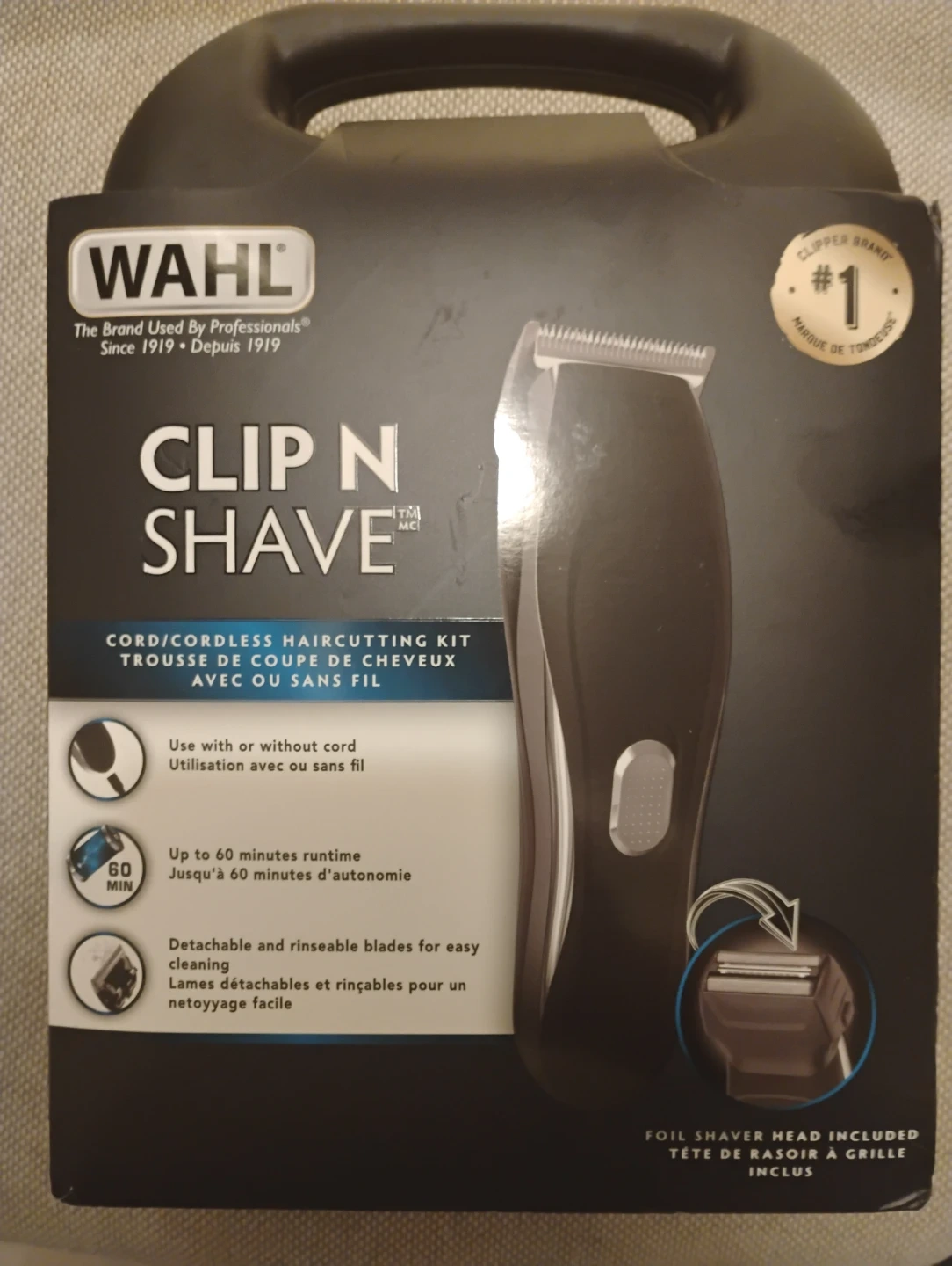 This Wahl Clip N Shave is a cord/cordless haircutting kit. It offers up to 60 minutes of runtime and has detachable, rinseable blades for easy cleaning. A foil shaver head is included.