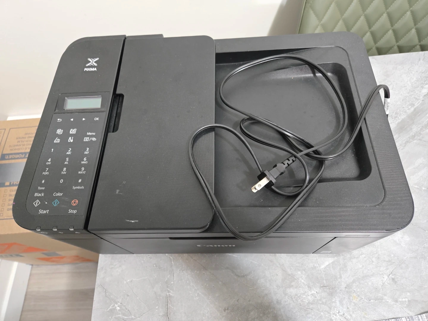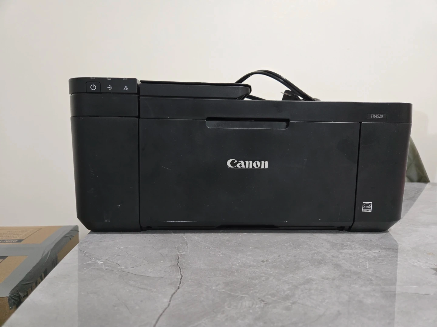 Canon PIXMA TR4520 all-in-one printer. It's black and comes with the power cord. This printer is wireless and supports printing, scanning, copying, and faxing.
