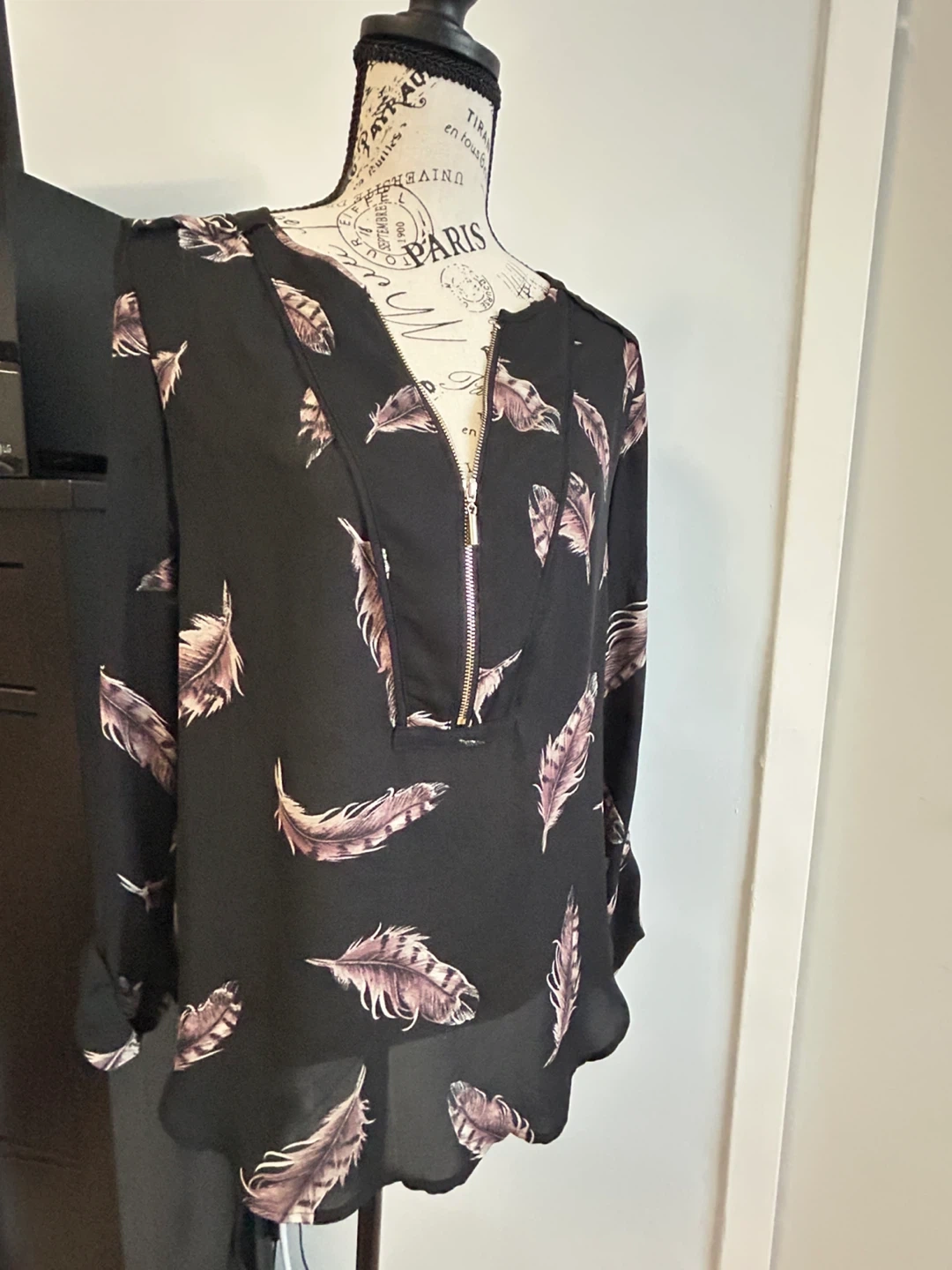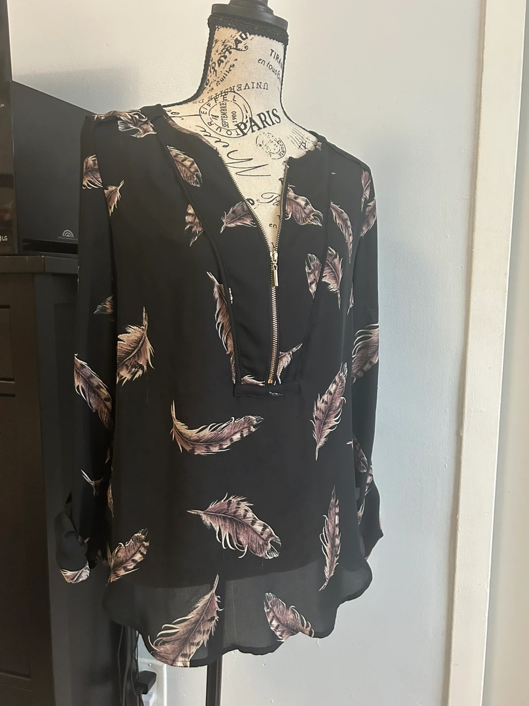 Black Dynamite blouse with a feather print. It's a size TP/XS but it actually fits like s/m