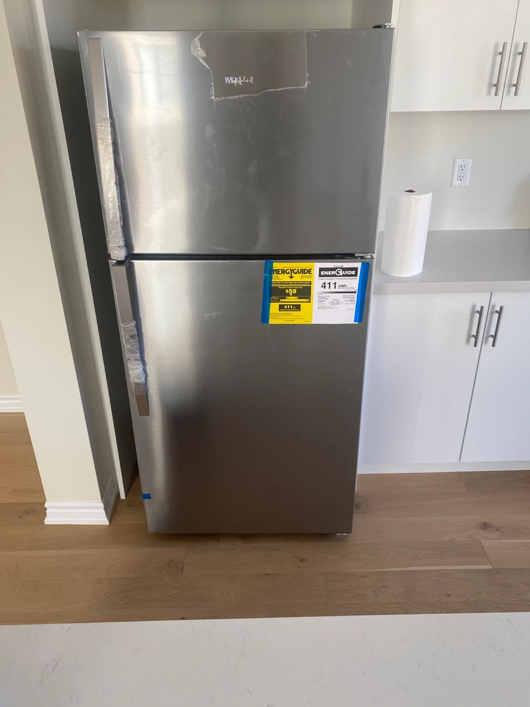 Brand new Whirlpool top-freezer, frost-free refrigerator. Capacity: 18.2 cubic feet. Estimated yearly electricity use is 411 kWh.