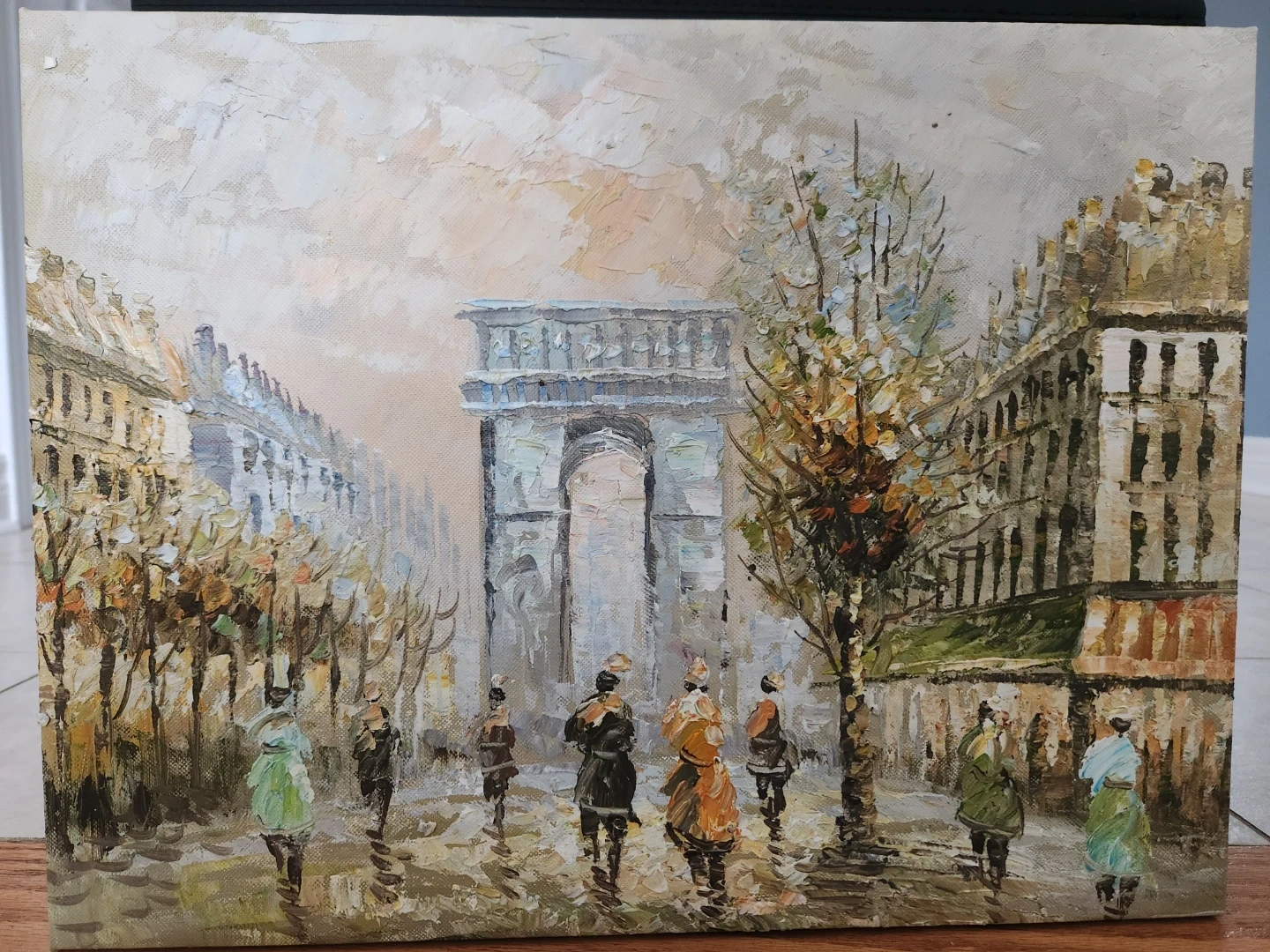 Oil painting of a Parisian street scene with the Arc de Triomphe. Textured brushstrokes capture the atmosphere of a city street. 40 by 31 cm