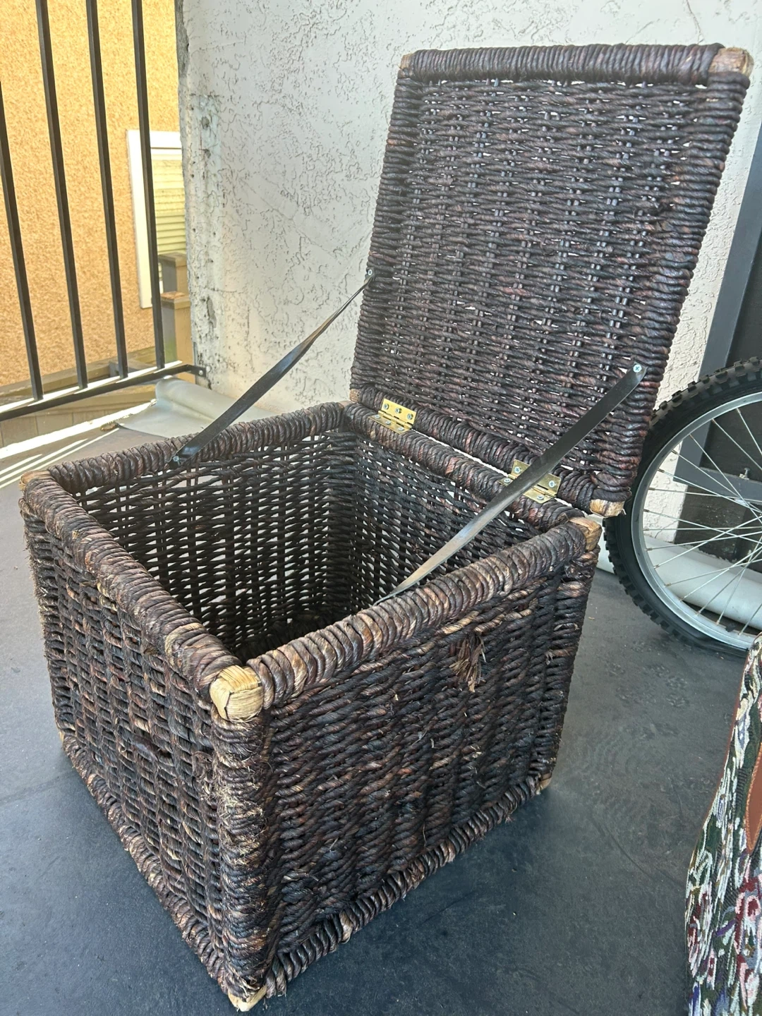 Selling a dark brown wicker storage chest with a hinged lid. Its woven construction makes it a unique accent piece for any room. The lid opens to reveal ample storage space inside.