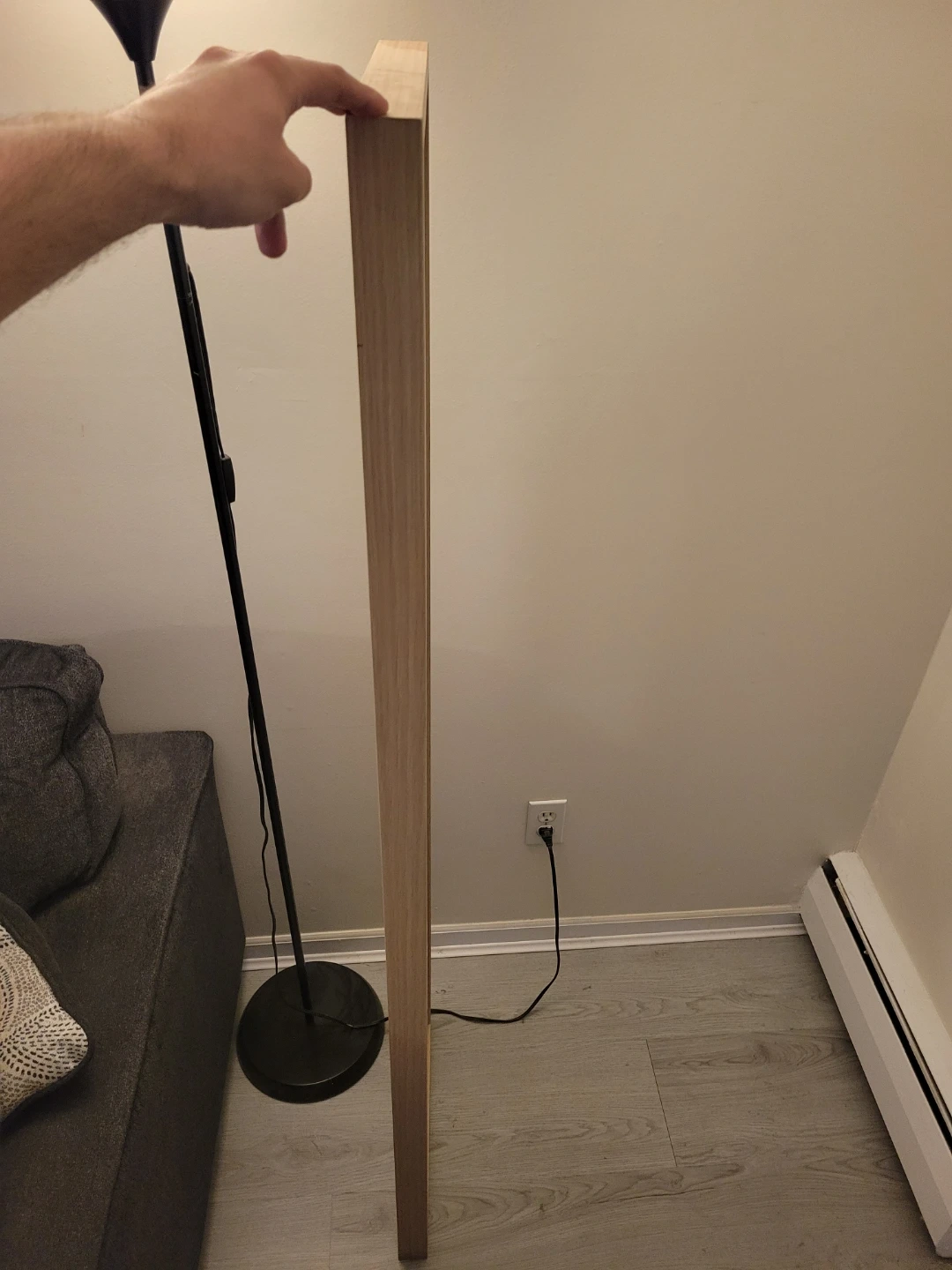 This is a full-length mirror with a clean, light-coloured wooden frame. It's tall and narrow, perfect for checking your outfit. The simple design fits many decors.