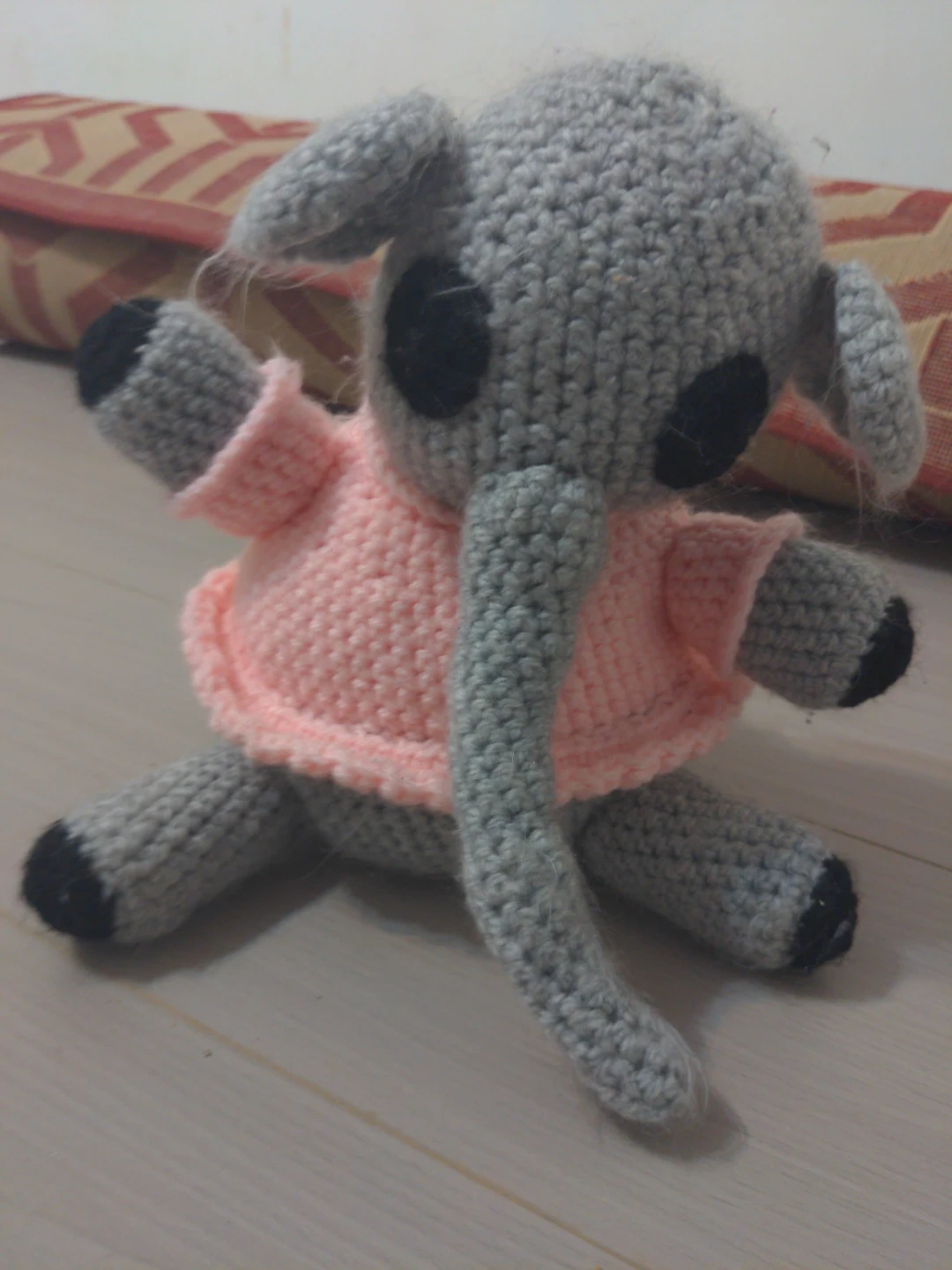 Handmade grey elephant plushie wearing a pink knitted sweater. It's a soft and cuddly toy perfect for little ones. This item is made from yarn and filled with stuffing.