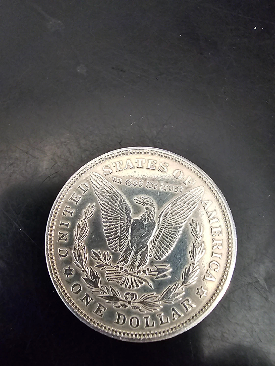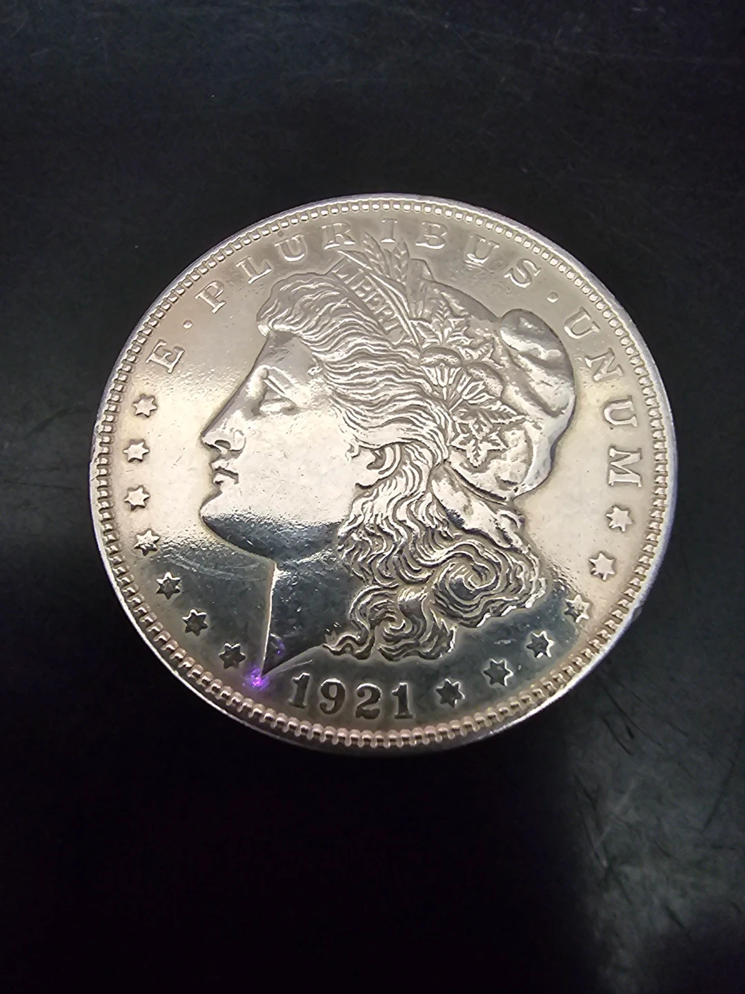This is a 1921 Morgan Silver Dollar coin. It features Lady Liberty on the obverse and an eagle on the reverse. This coin is a significant piece of American numismatic history.