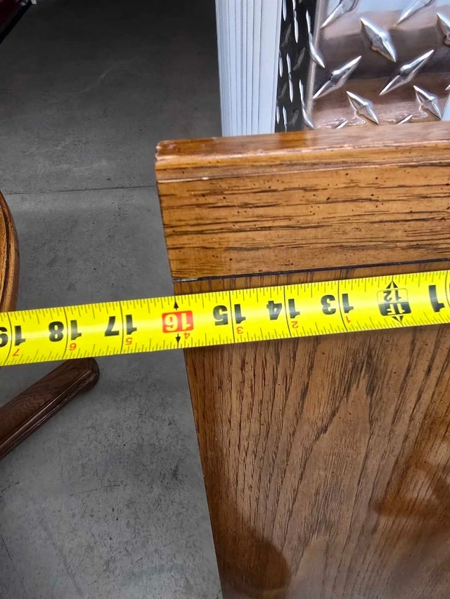 This is a round table with a sturdy pedestal base, perfect for adding a touch of classic charm to any room. The table exhibits signs of wear on the top surface, as highlighted in the photos. Despite its imperfections, it remains a functional and stylish piece. Two 16 inch leaves are included. Approximate Dimensions: Diameter: 50 inches, Height: 32 inches. If this ad is still up, the table is still available!