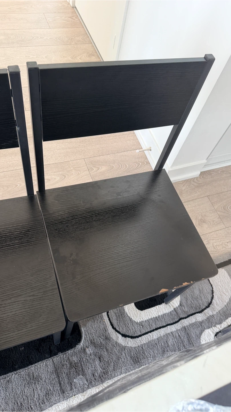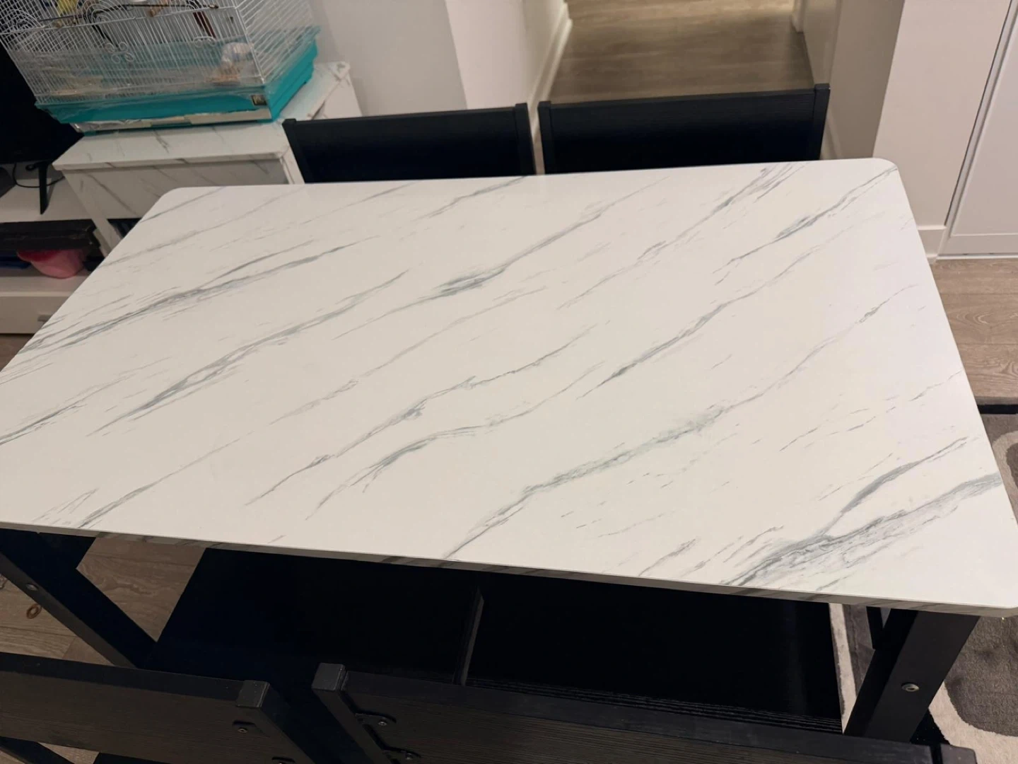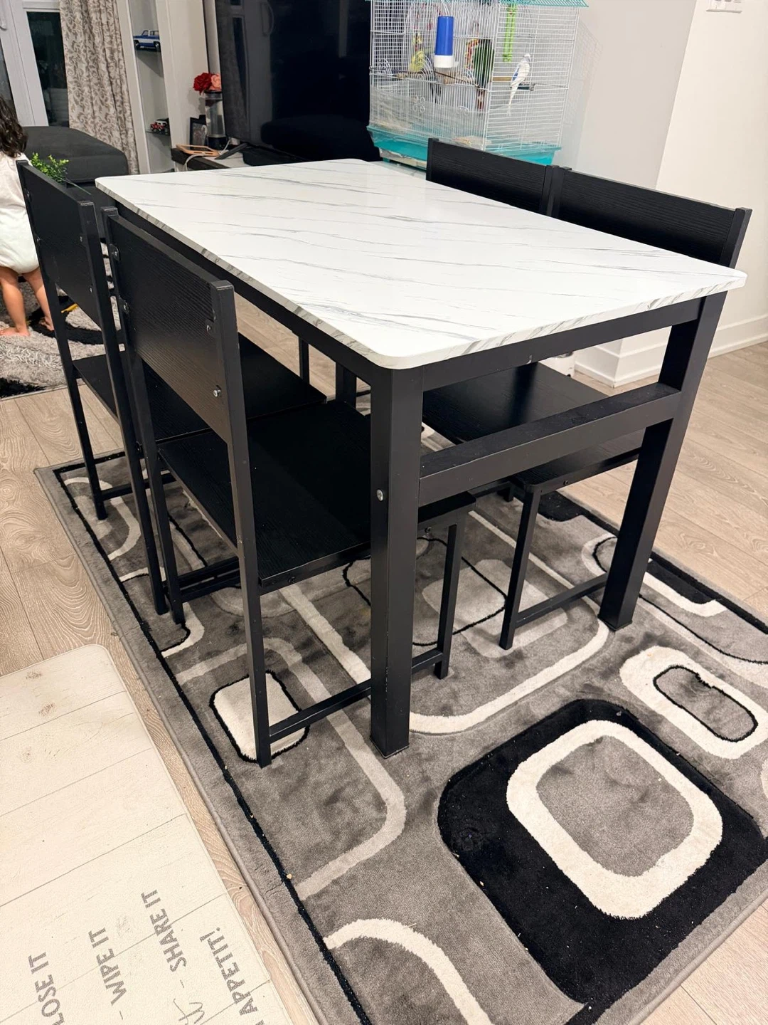 Four-piece dining set featuring a white marble-look tabletop and four black wooden chairs. This set's compact design is suitable for smaller dining areas. Chairs are made of black wood and have a simple, modern silhouette.