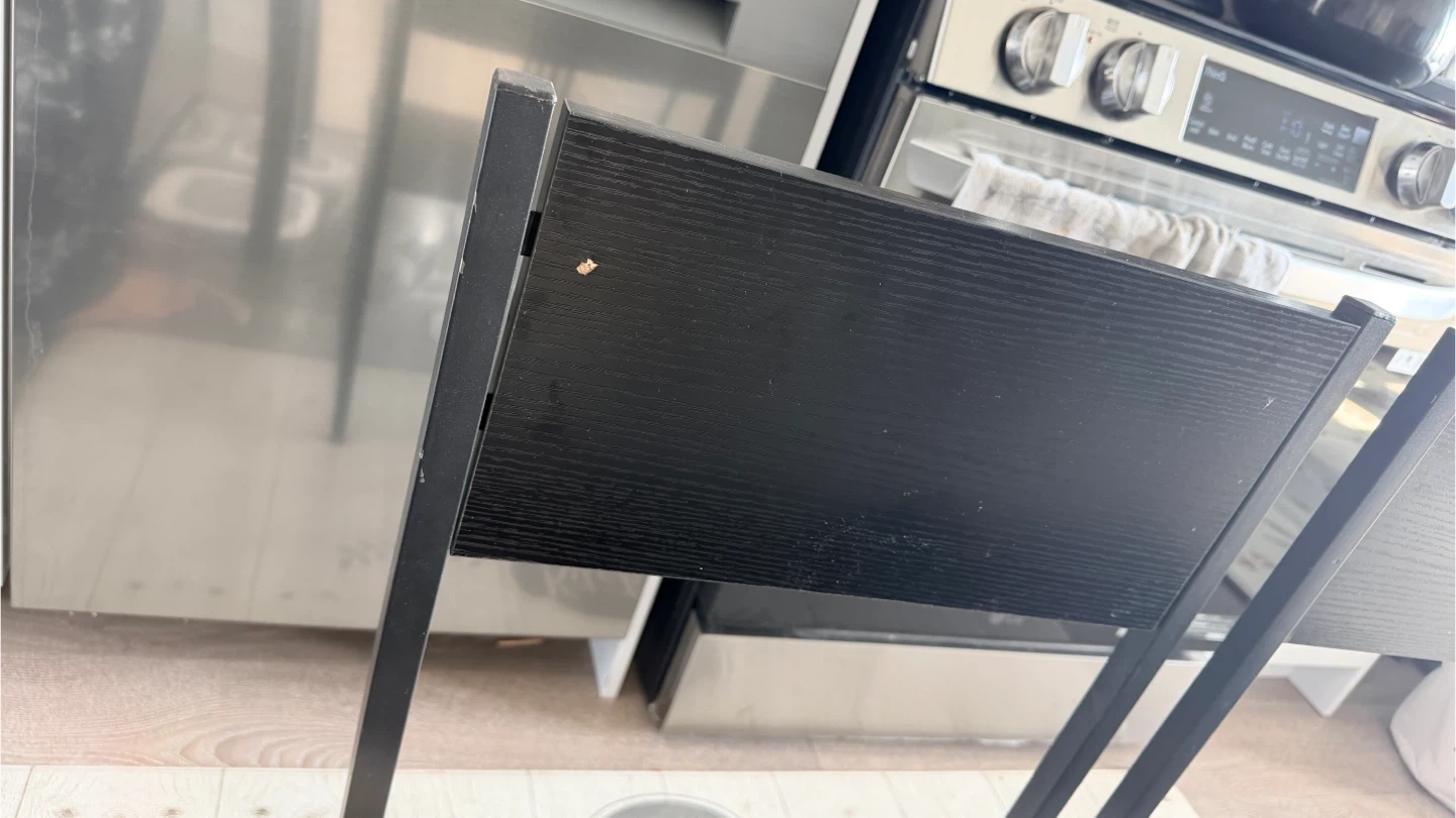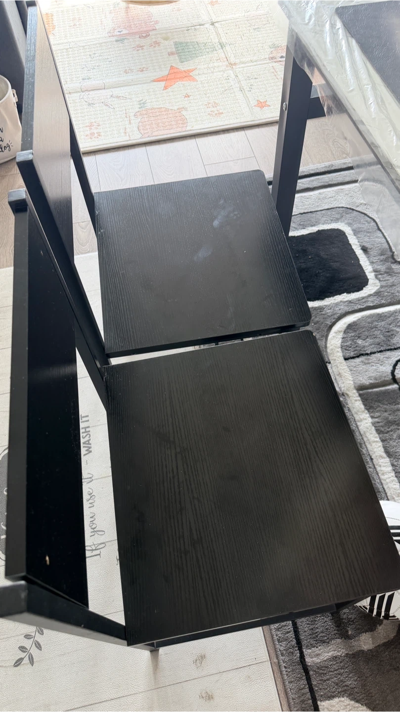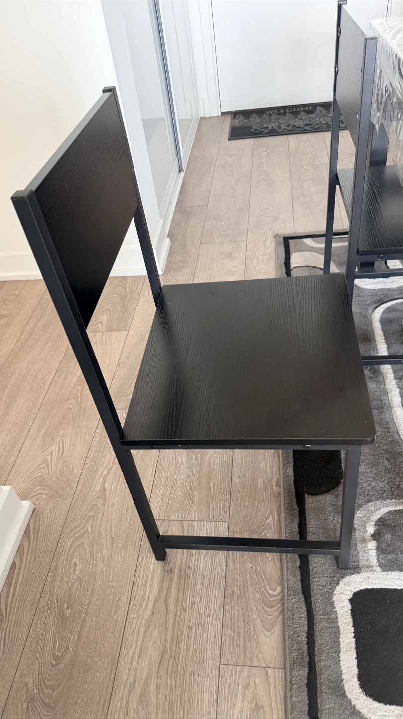 Four-piece dining set featuring a white marble-look tabletop and four black wooden chairs. This set's compact design is suitable for smaller dining areas. Chairs are made of black wood and have a simple, modern silhouette.