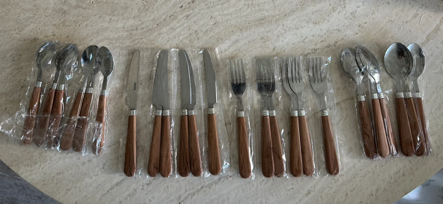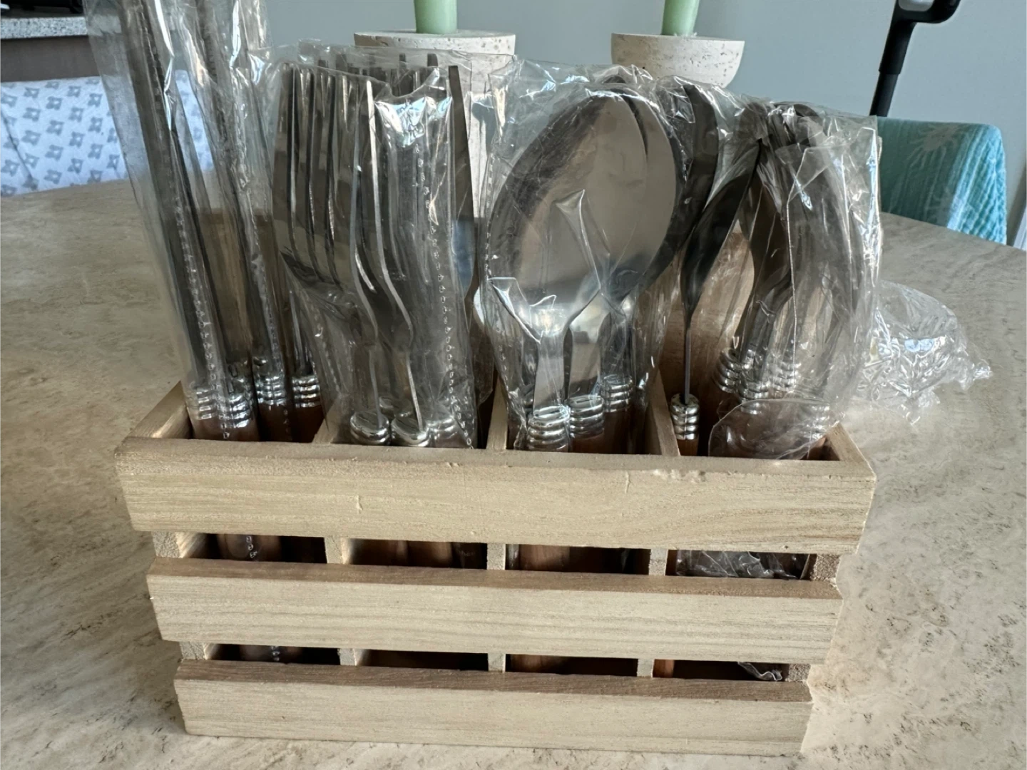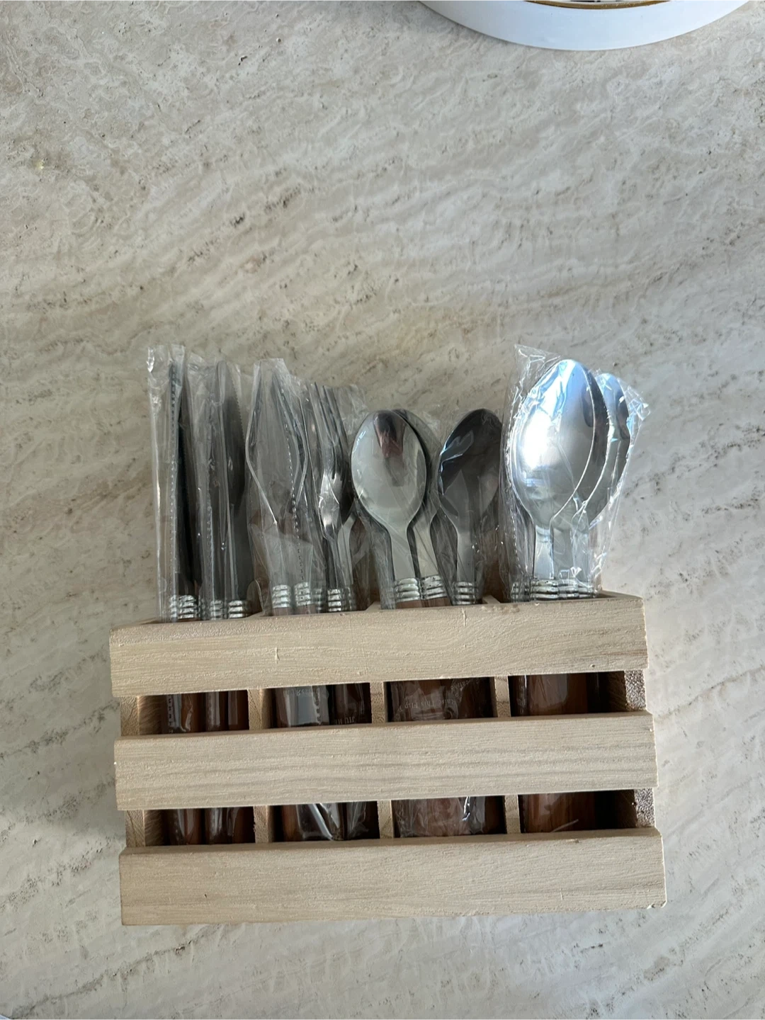 This cutlery set includes spoons, forks, and knives, alllike wooden handles. It comes in a light wood crate for storage. Ready for your next dinner party or everyday use!