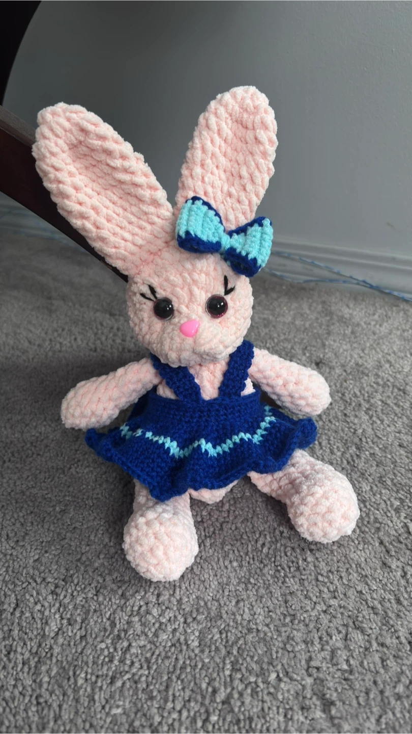 This is a cute, handmade crochet bunny plush toy. It's made from soft, yellow yarn and features a little blue bow. It would make a sweet gift for anyone who loves bunnies!