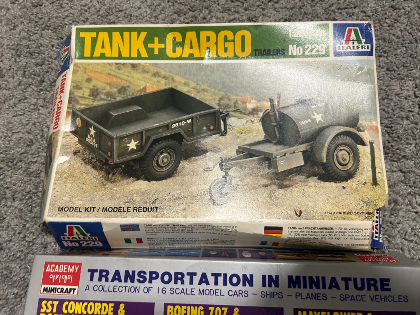 Selling an Italeri Cargo Truck GMC 6x6 2 1/2 Ton 1:35 scale model kit. It is No 205. Also includes Tank + Cargo Trailers No 229 and Academy Minicarft Transportation in Miniature model kit. West Germany tank. Vintage toys come in original boxes 10 for all of them
