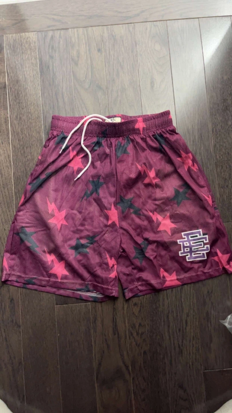 Eric Emanuel shorts in a burgundy colourway. Features a star and lightning bolt pattern. Mesh material with drawstring waist. Great for warm weather activities!