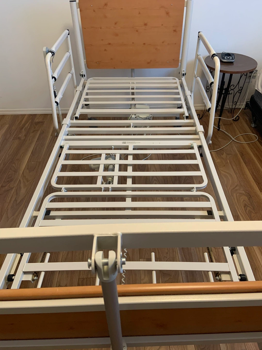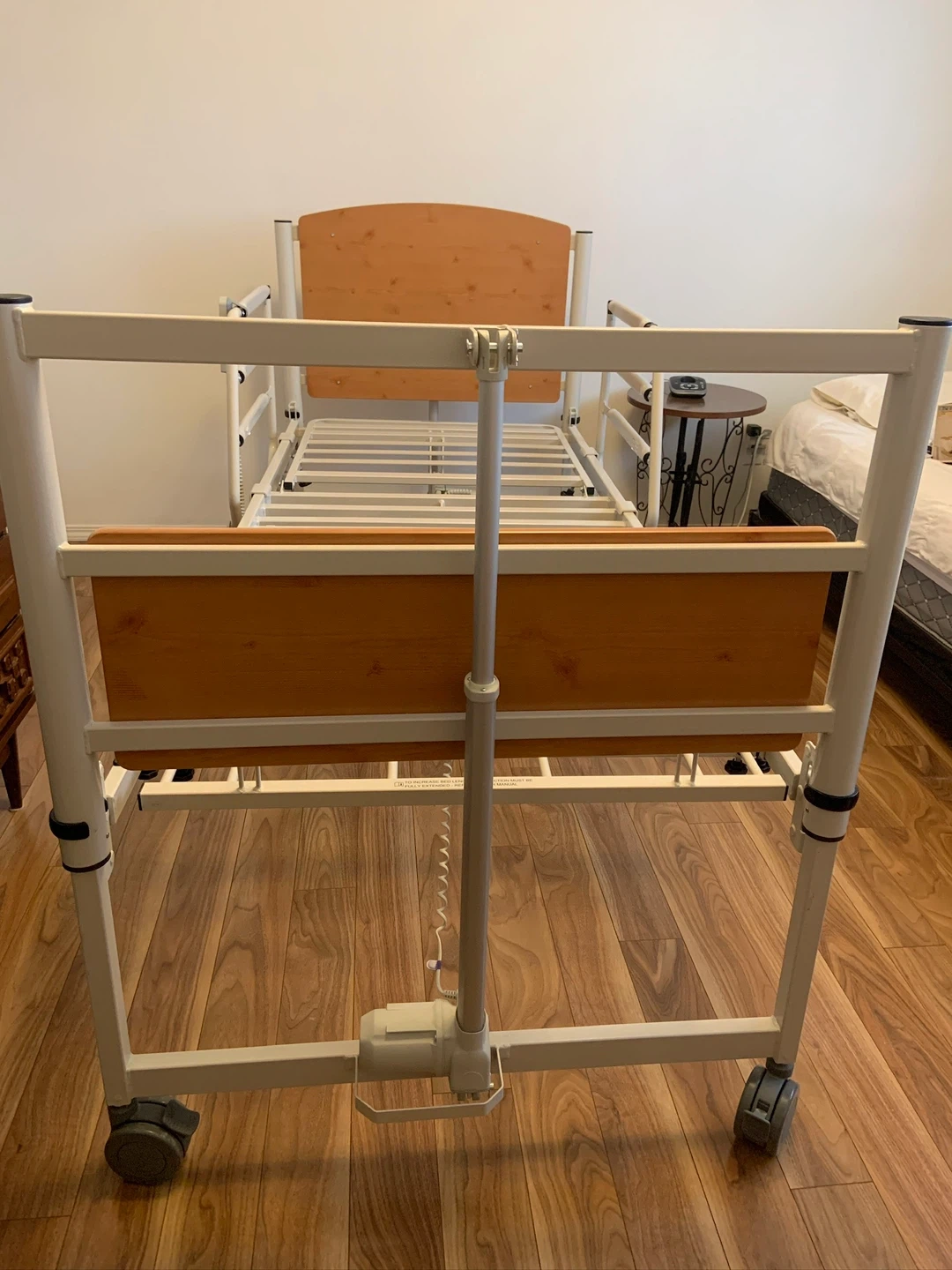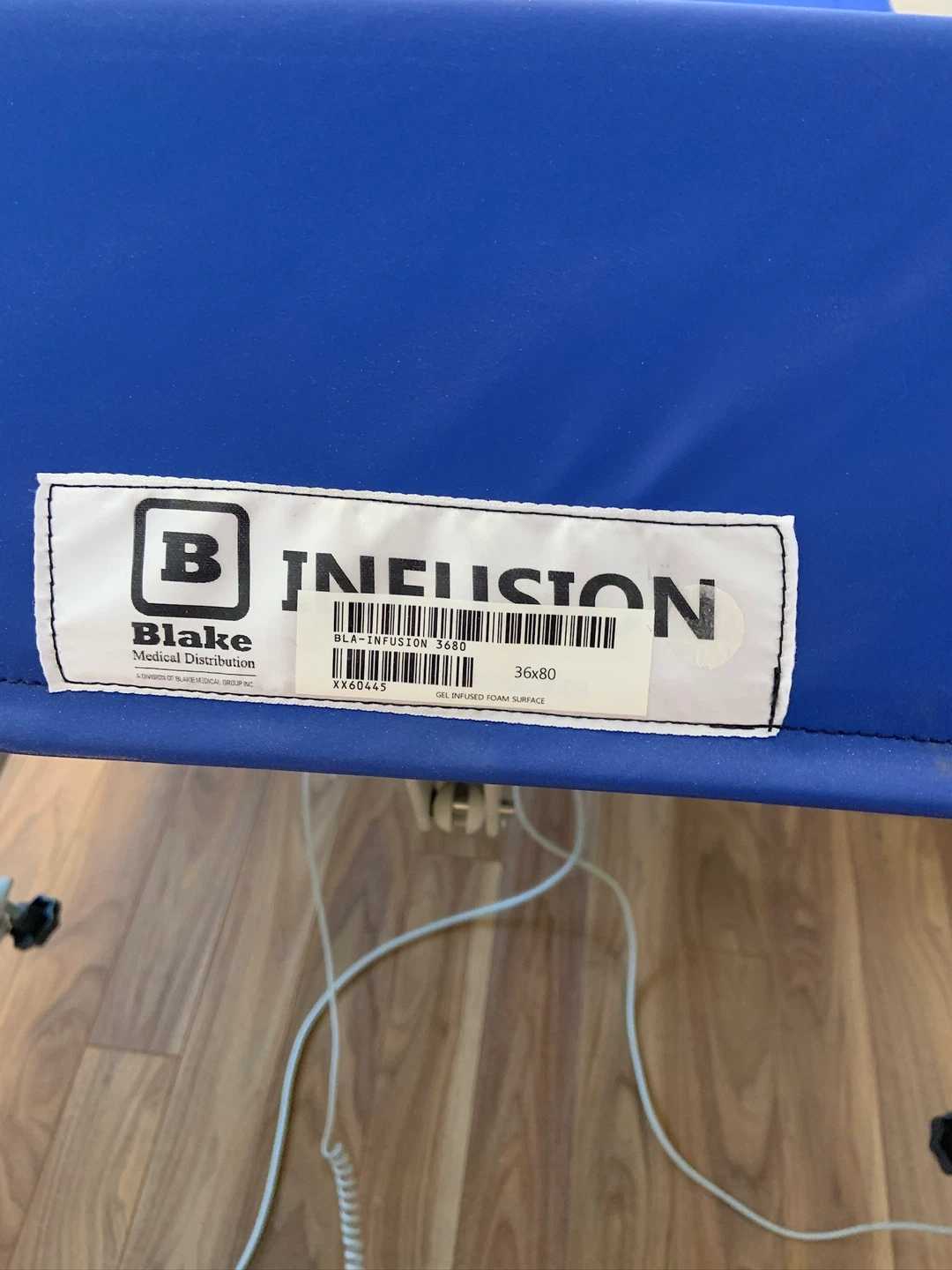 This is a Blake Medical Distribution "Infusion" hospital bed. It's designed with a gel-infused foam surface for comfort. The bed features an adjustable frame with wheels for easy mobility.