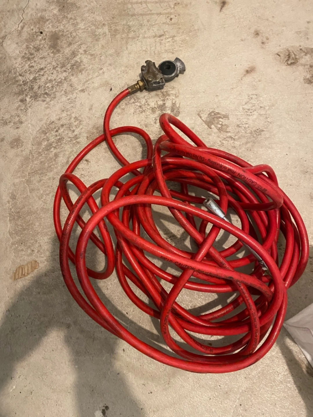 This is a red air hose with a metal connector attached. It's a good length for various workshop tasks. Used for compressed air applications.