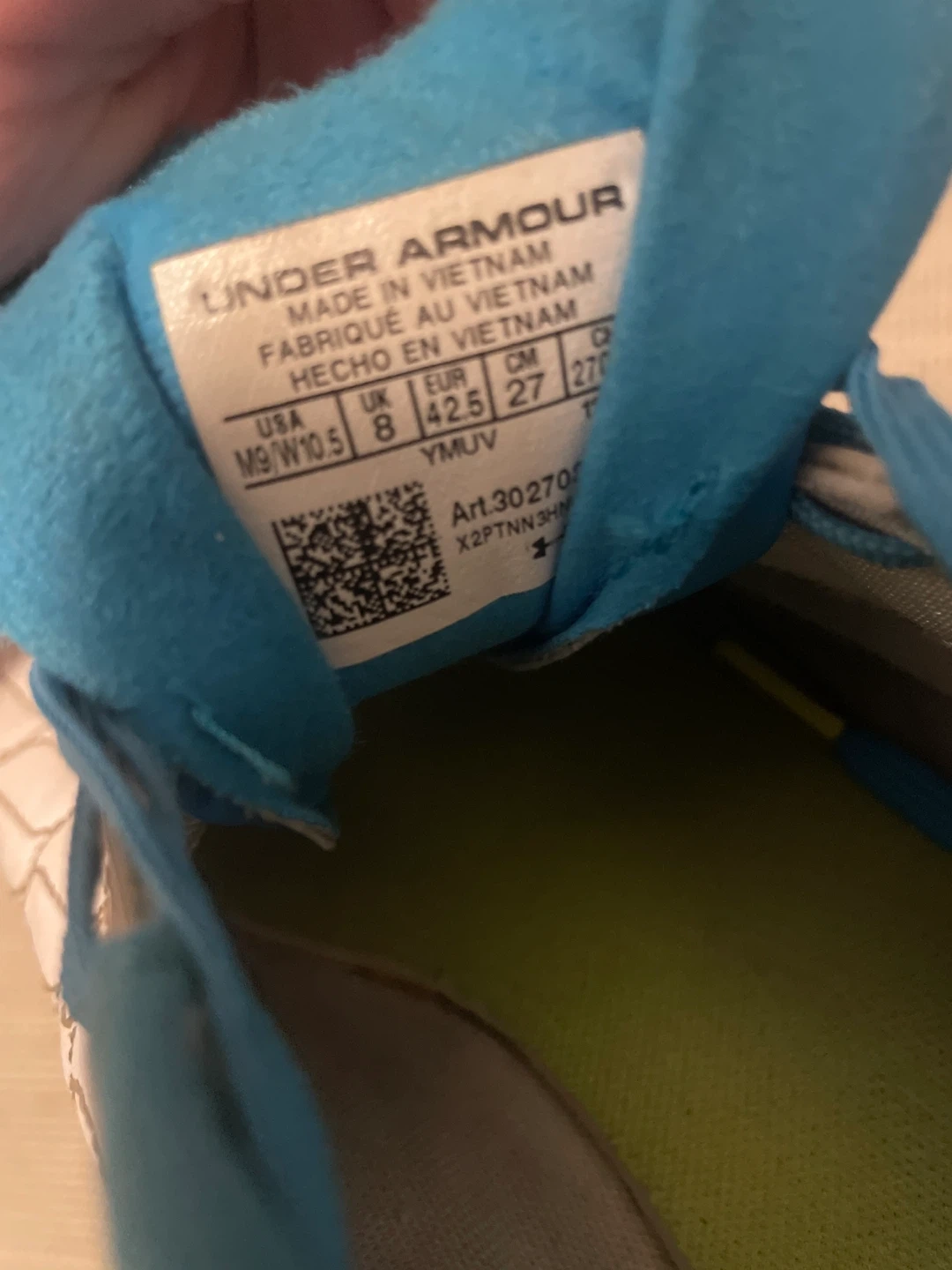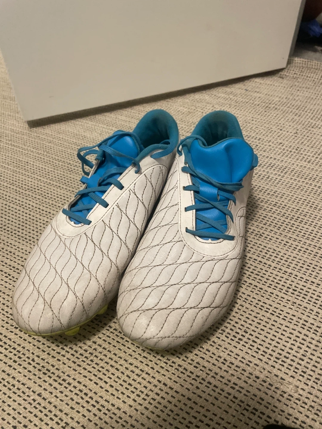 White Under Armour soccer cleats with blue accents. These cleats are a men's size 9 and have a durable outsole for traction on the field. They're ready for your next game!