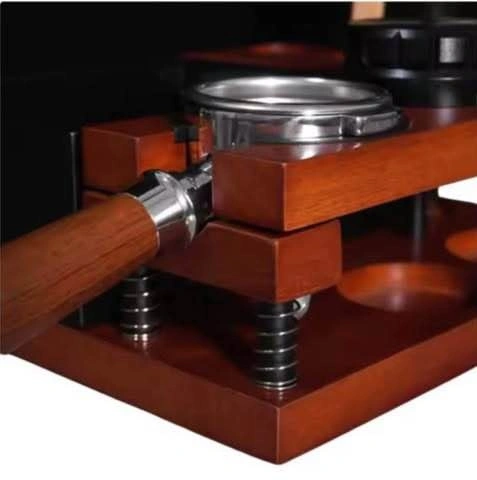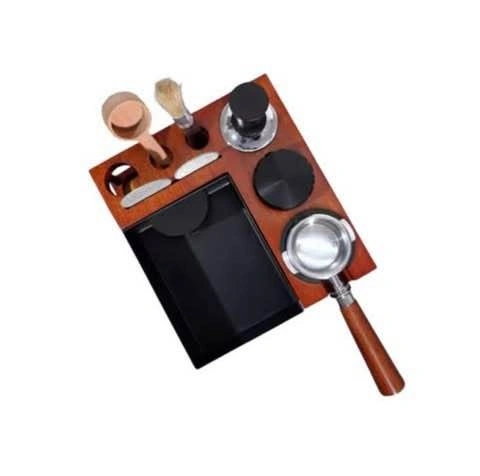 All-in-one organizer: Keeps your tamper, distributor, knock box, and filters neatly stored while prepping espresso shots. Made of sturdy wood with a spring-loaded portafilter holder that securely accommodates all standard sizes. The built-in knock box catches grinds from pulled shots to minimize mess and clean-up time. Simple design allows for quick access to tools and can be easily wiped down to maintain its finish. Fits portafilters from most popular espresso machine brands, including Breville.