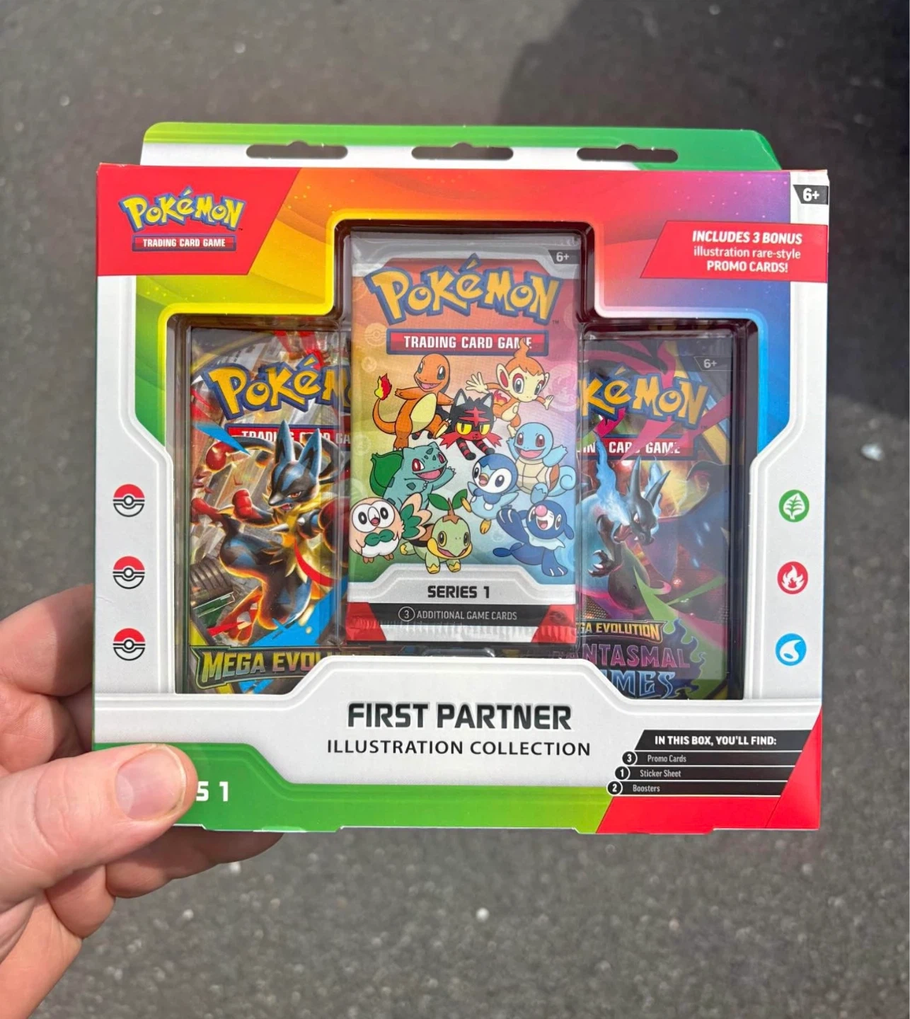 This Pokemon First Partner Illustration Collection includes 3 bonus illustration rare-style promo cards. In this box, you'll find 3 promo cards, 1 sticker sheet, and 2 booster packs. This collection is suitable for ages 6+.