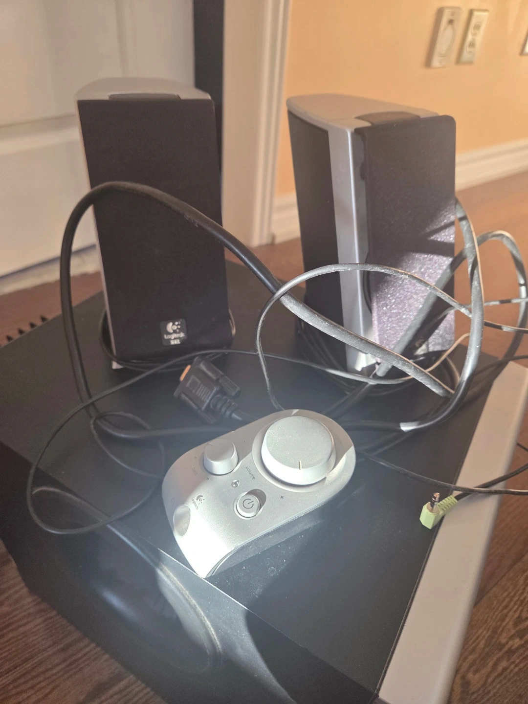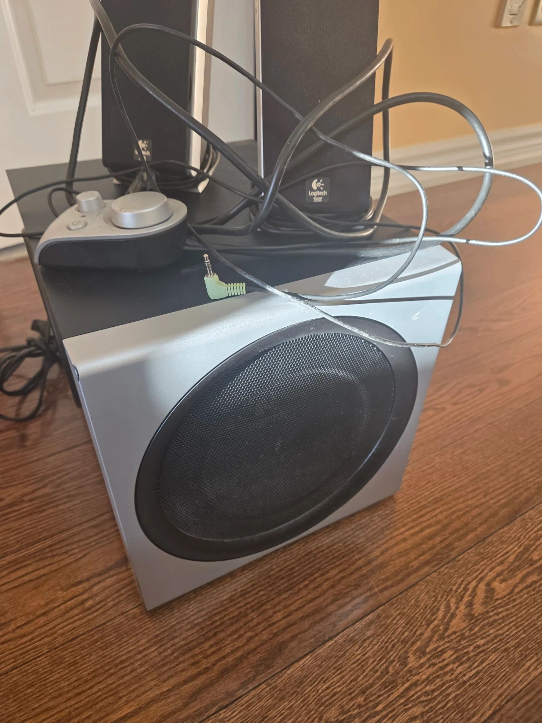 This is a Logitech Z-2300 speaker system. It includes the subwoofer and two satellite speakers. The control pod is also included for easy volume adjustment and power control. Power cord included.