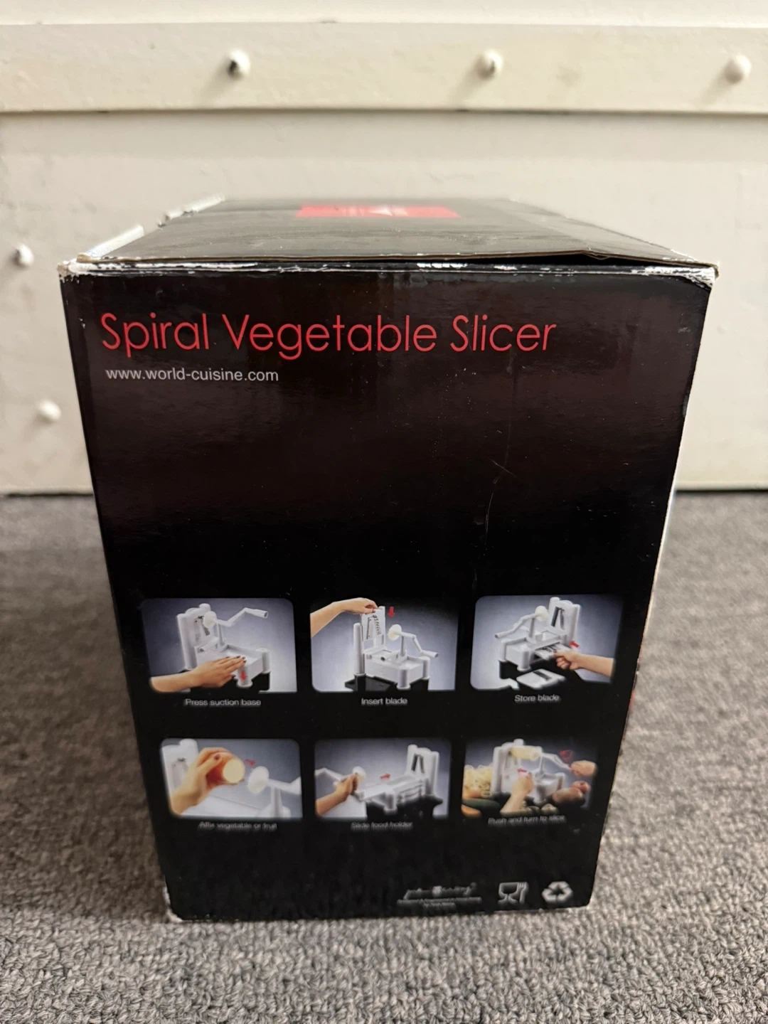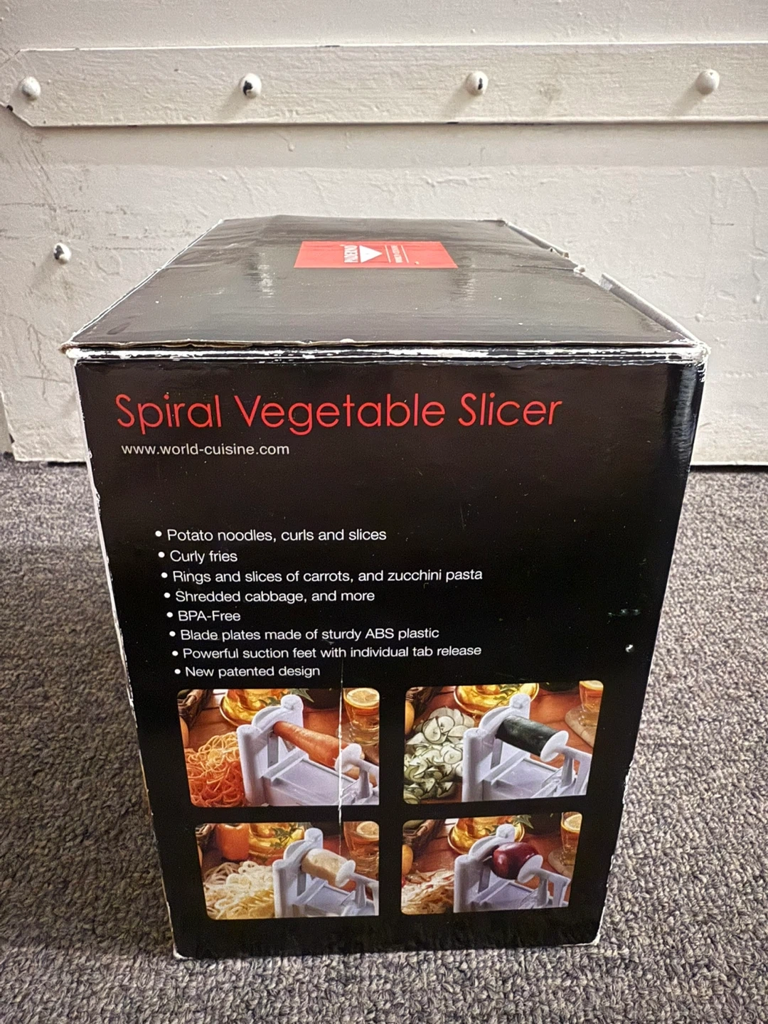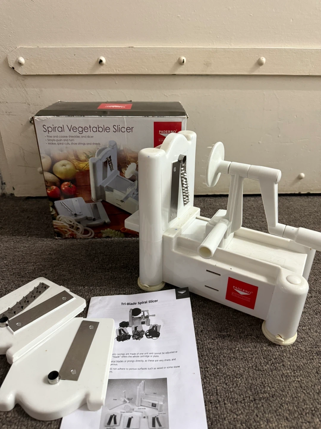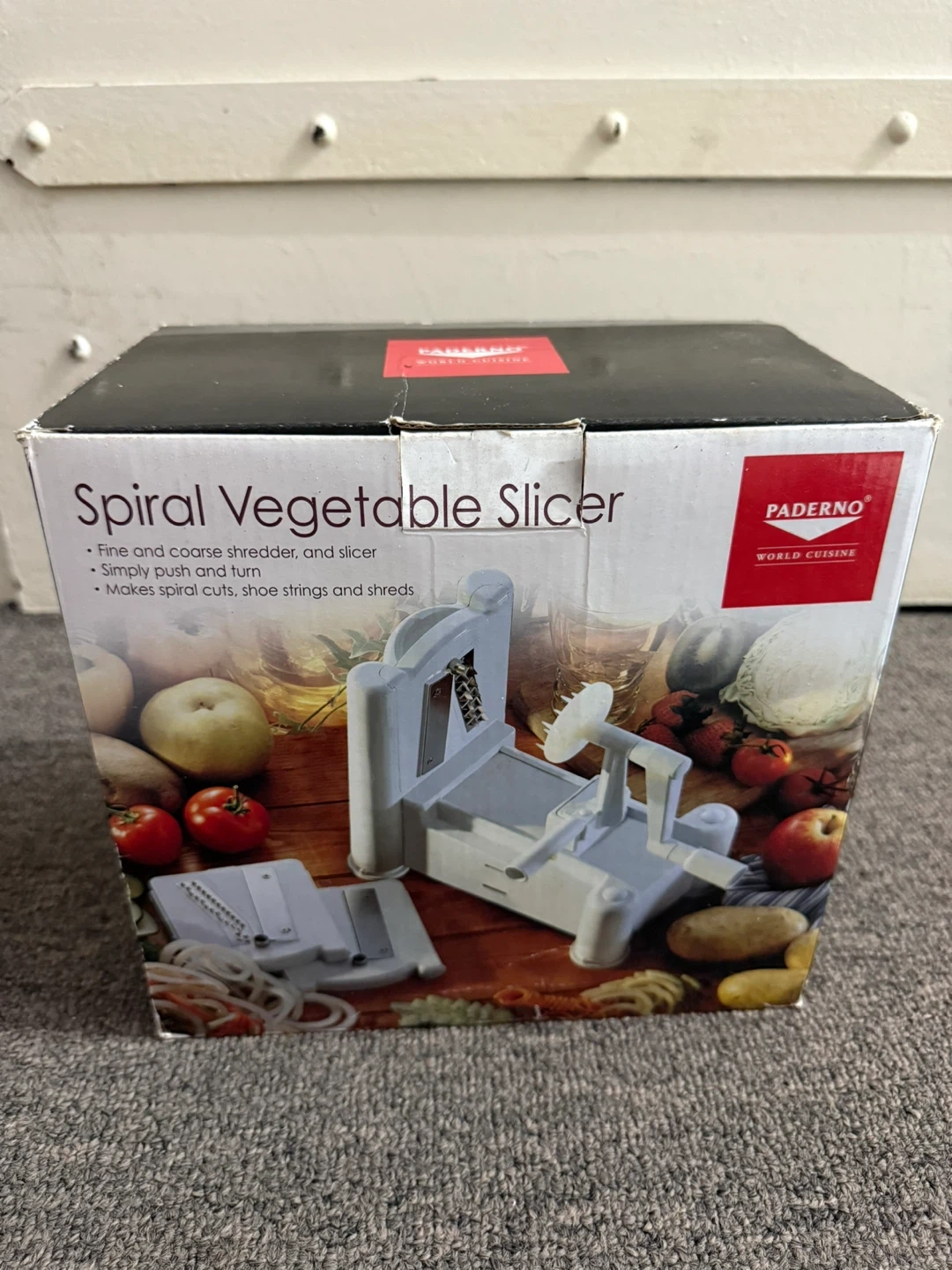 I'm selling a Paderno Spiral Vegetable Slicer! It's great for making potato noodles, curls, and slices, as well as curly fries. You can also make rings and slices of carrots and zucchini pasta, and shredded cabbage. The blade plates are made of sturdy ABS plastic, and it has powerful suction feet with individual tab release. It also has a new patented design and comes with the box