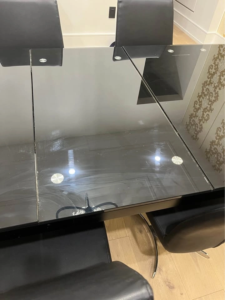 Luxury black glass Italian dining table, extendable for hosting family and friends, paired with 6 brand-new leather chairs. Bought for €4000