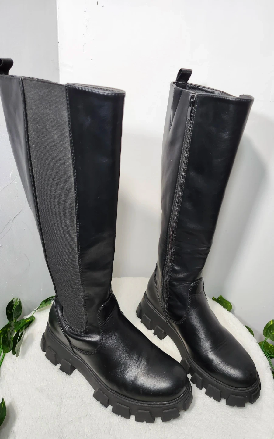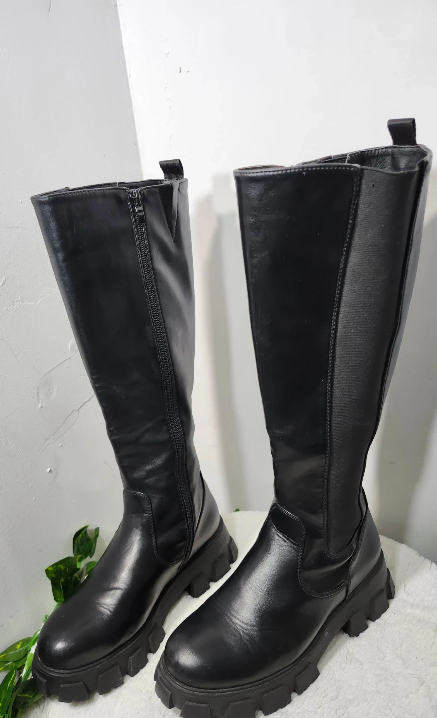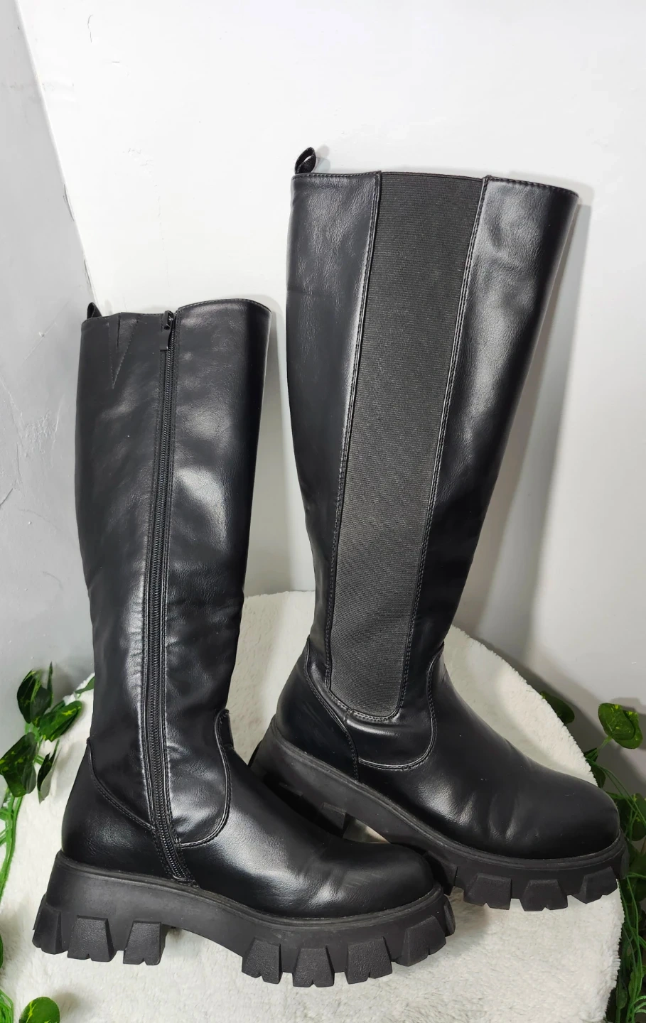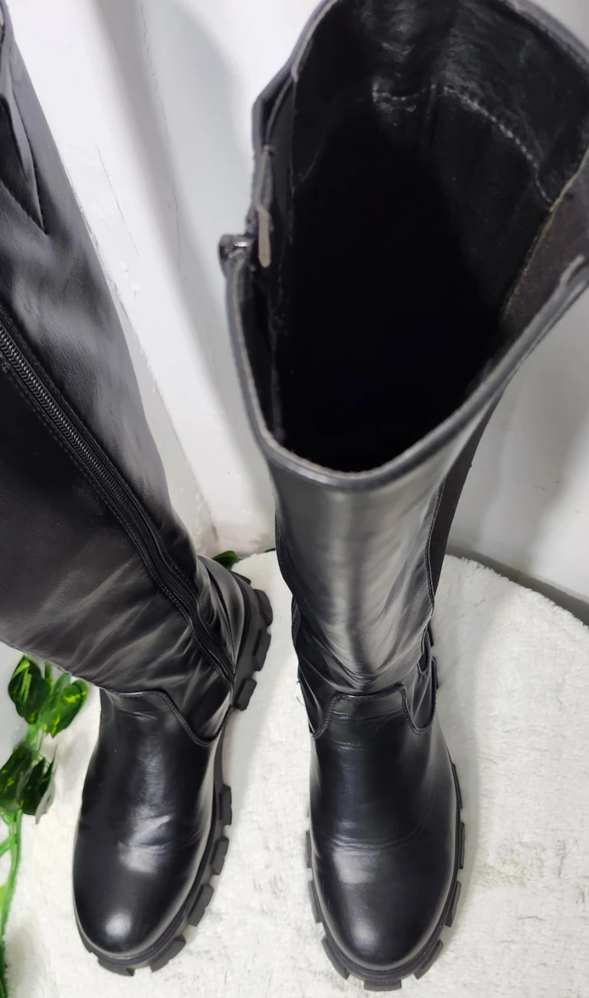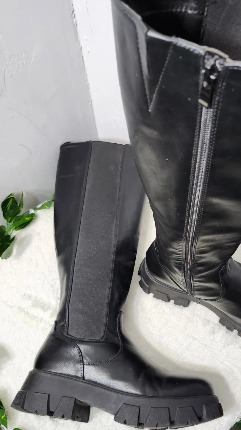 Estas botas negras de caña alta cuentan con una suela de plataforma gruesa y una cremallera lateral. Incorporan paneles laterales elásticos para un ajuste cómodo. Las botas están confeccionadas en piel sintética y material textil.