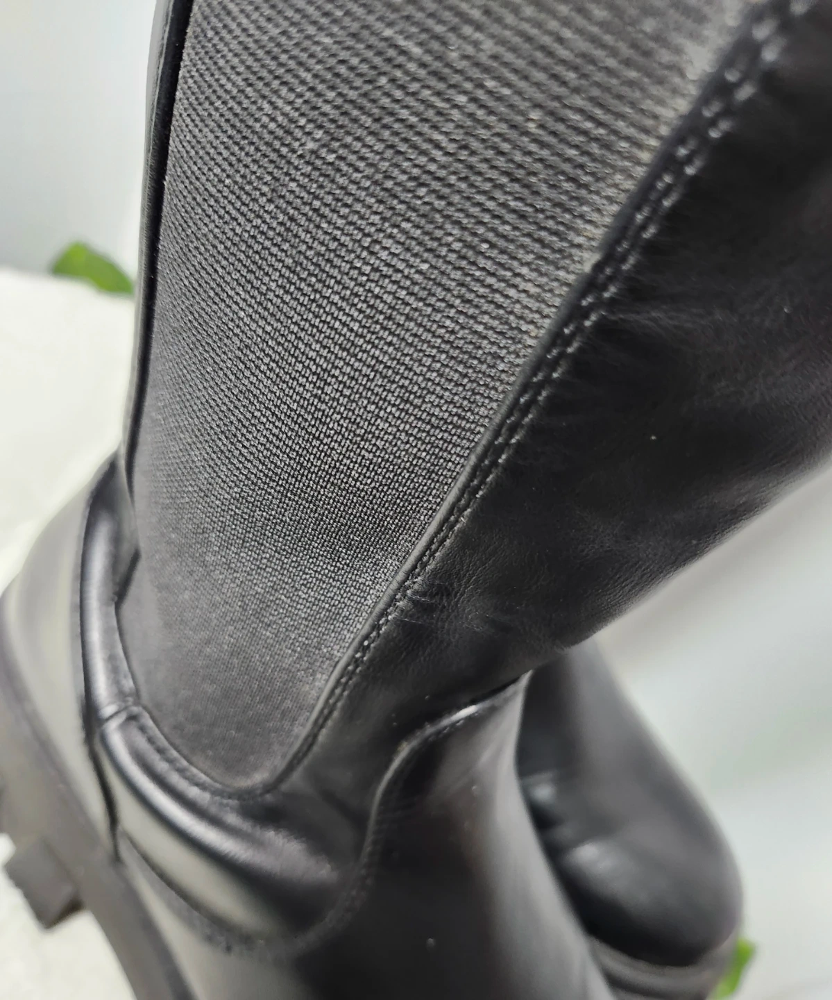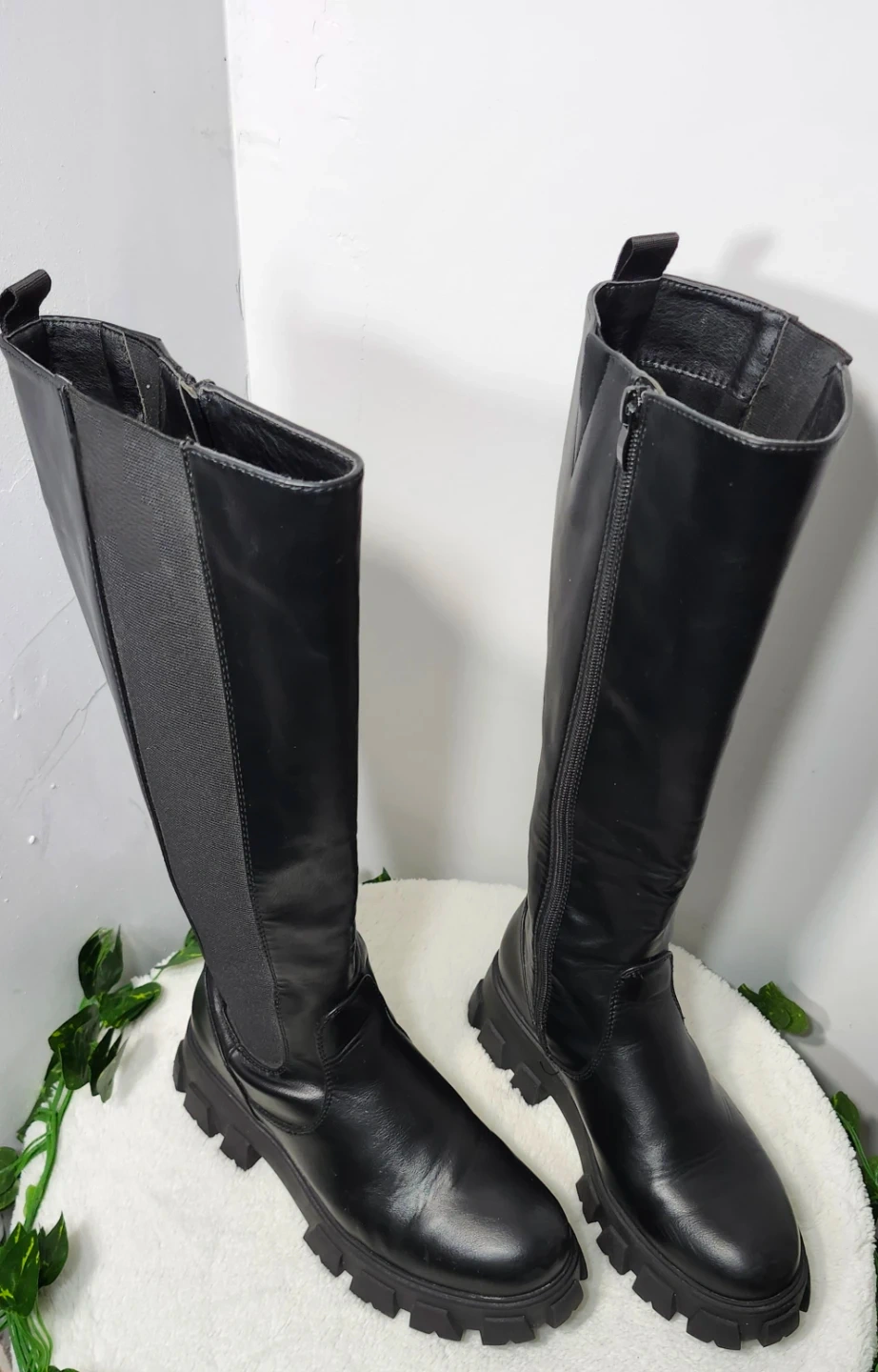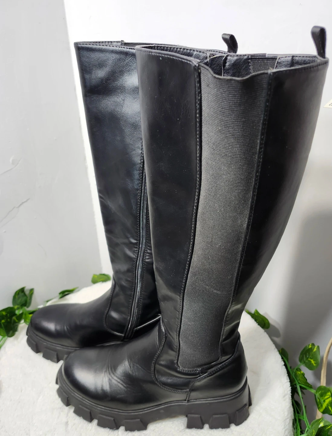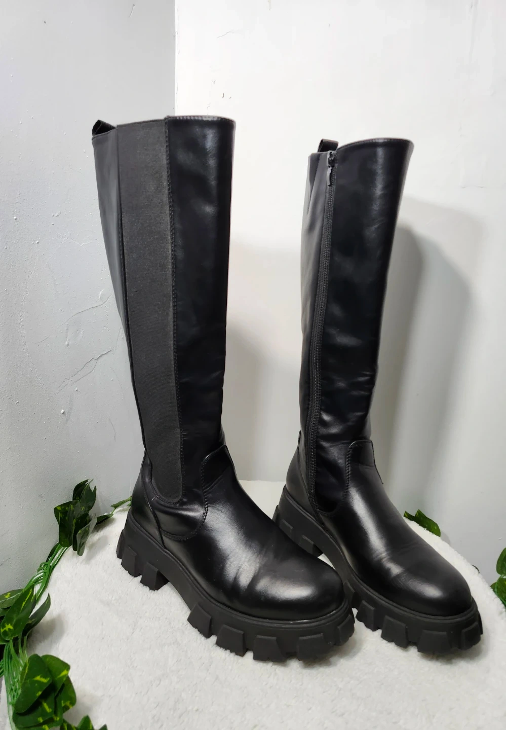 Estas botas negras de caña alta cuentan con una suela de plataforma gruesa y una cremallera lateral. Incorporan paneles laterales elásticos para un ajuste cómodo. Las botas están confeccionadas en piel sintética y material textil.