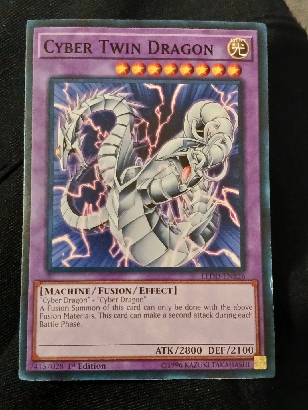 Yu-Gi-Oh! Cyber Twin Dragon 1st Edition trading card. This is a Fusion Monster card with 2800 ATK and 2100 DEF. It's part of the 'Ledge' set and is 1st Edition. Cash only. Pick up or meet up in public place.