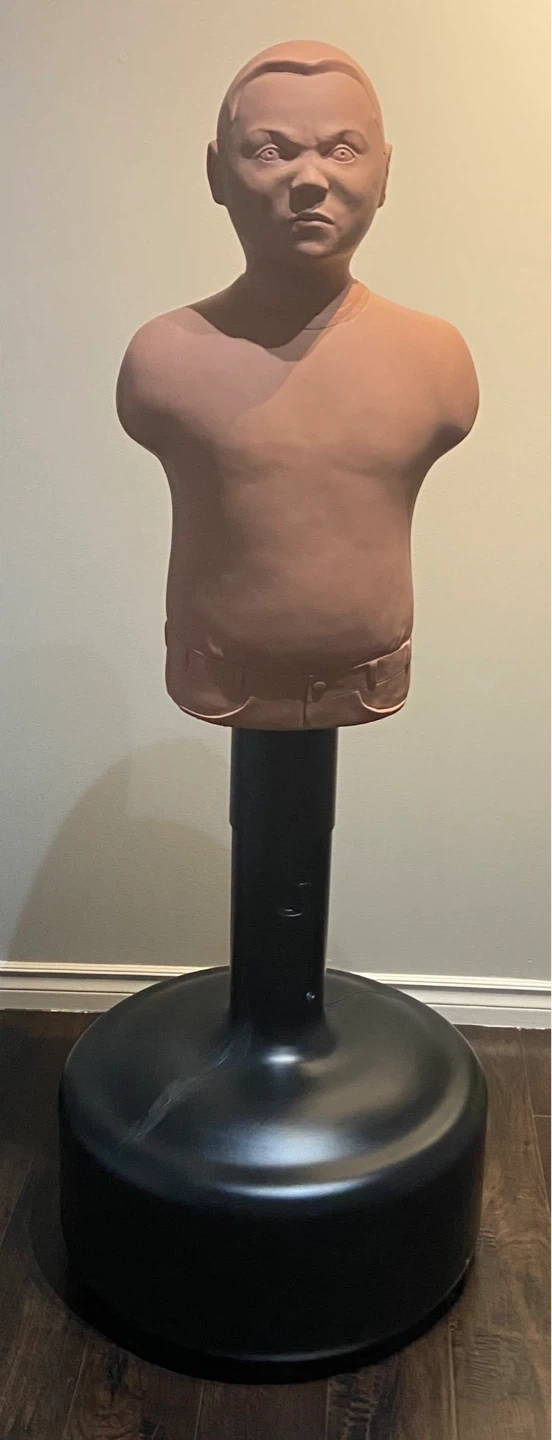 This is a free-standing dummy punching bag. It's designed for martial arts training. The base is fillable for stability.