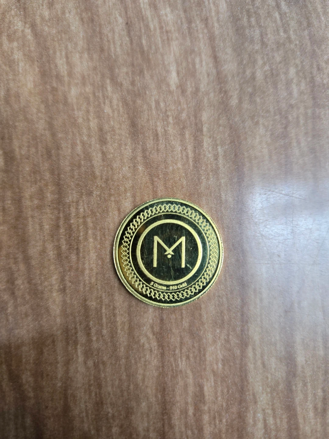 This is a solid gold coin weighing 8 grams with a purity of 916 gold. It features a decorative floral design on one side and a stylized "M" logo on the other. A lovely piece for collectors or as a special gift!