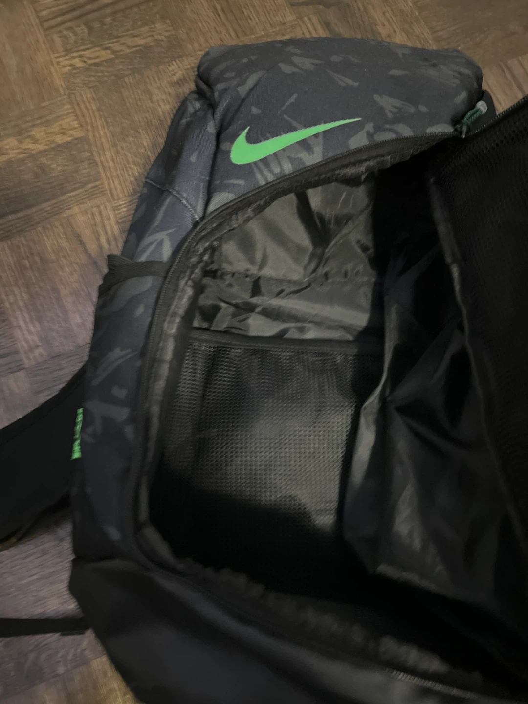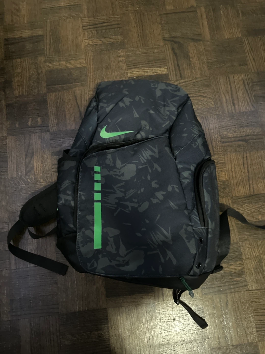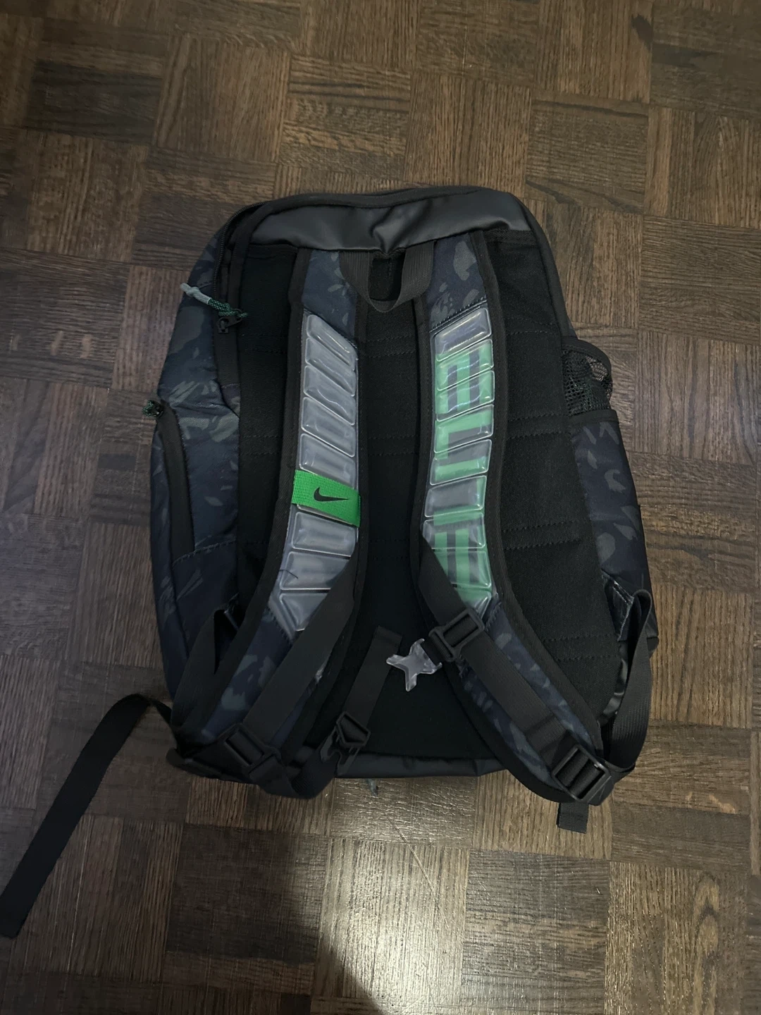 This is a Nike backpack with a black and grey camouflage print. It features multiple compartments and adjustable padded straps. It's great for carrying sports gear or everyday essentials.