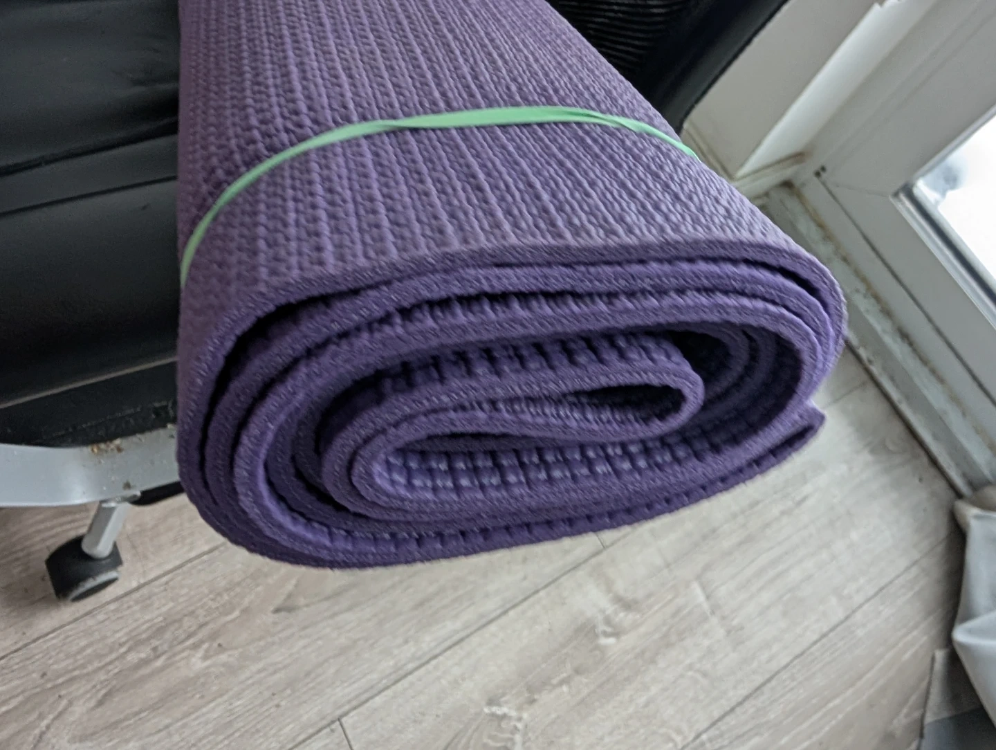 This is a standard yoga mat in a lovely purple colour. It's made from a durable foam material, offering good cushioning for your workouts. It rolls up easily for storage and transport.