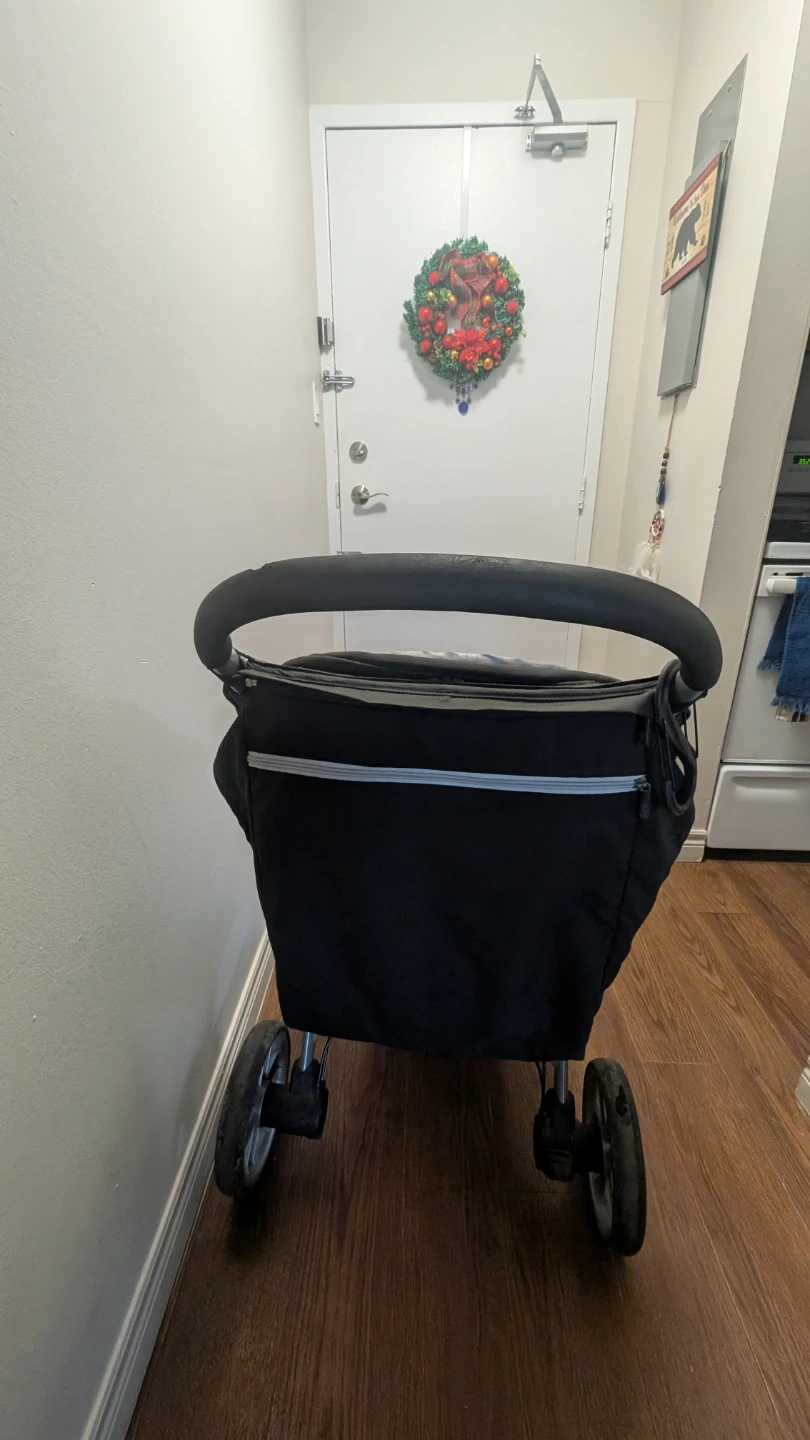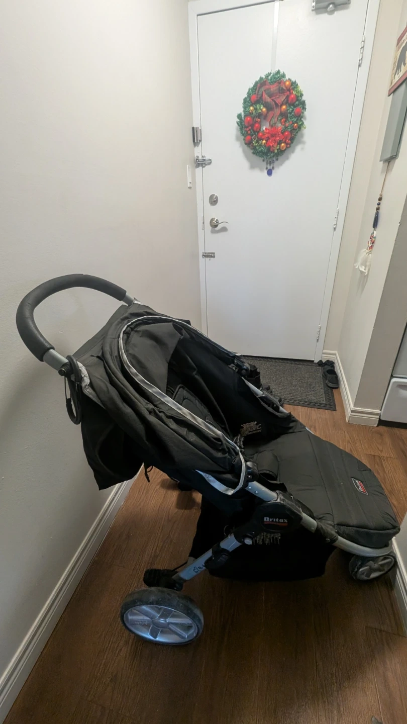 This is a black Britax stroller. It features a comfortable padded seat and an adjustable canopy. The stroller has a sturdy frame and smooth-rolling wheels.