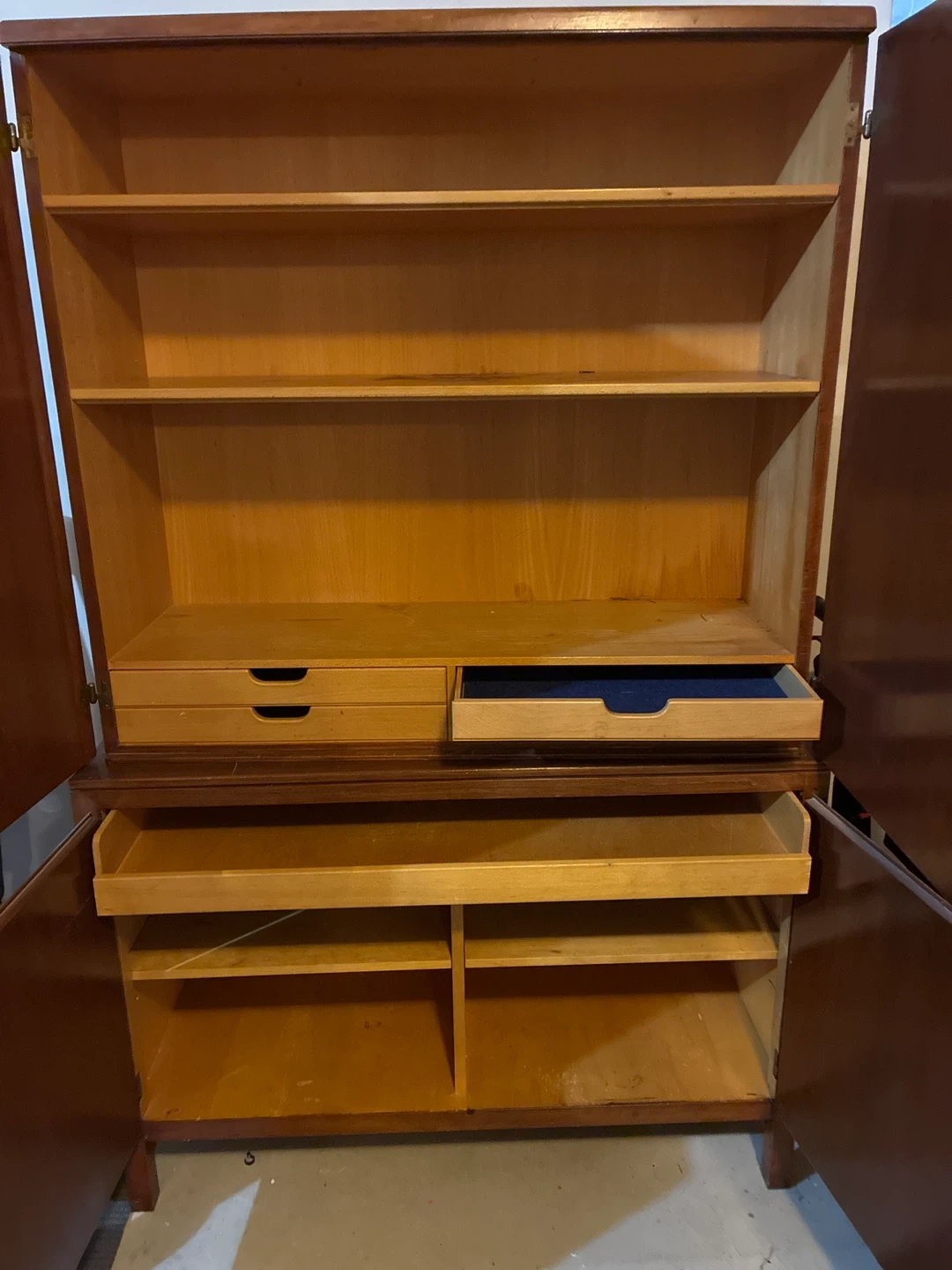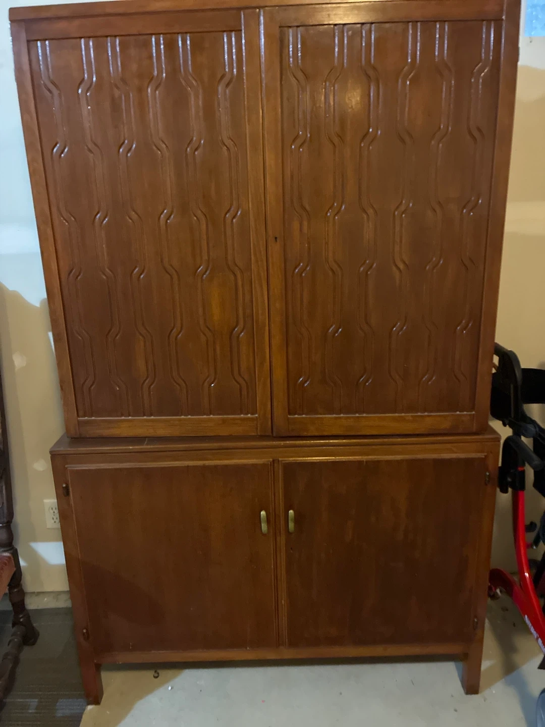 This is a vintage wooden cabinet with multiple shelves and drawers. It's made of wood and has a dark brown finish. The cabinet features a decorative pattern on the upper doors. It offers ample storage space.