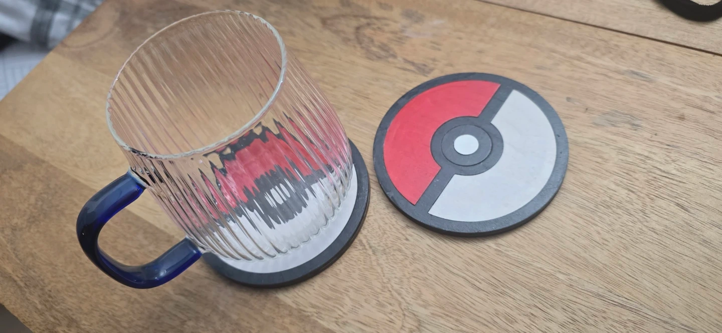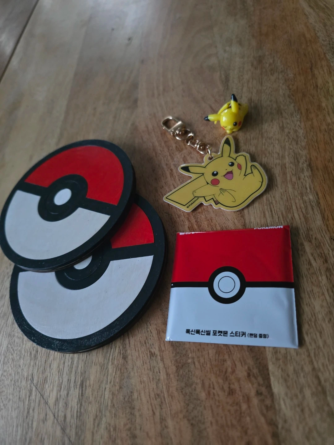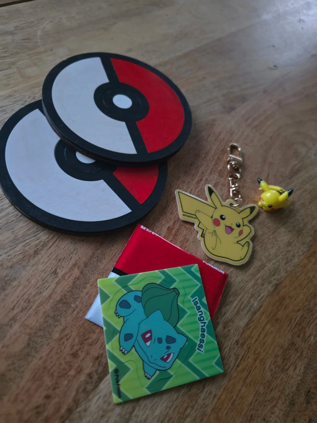This set includes two Pokeball-themed coasters and a Pikachu keychain. They're great for any Pokemon fan's desk or coffee table!
