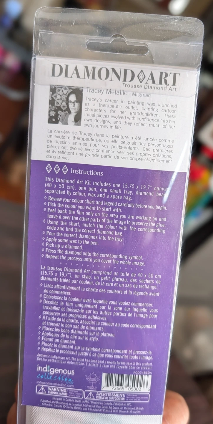 This Diamond Art kit includes one 15.75 x 19.7 inch canvas and diamond beads. It's based on original indigenous art by Tracey Metallic, Mi'gmaq. Create your own sparkling masterpiece!