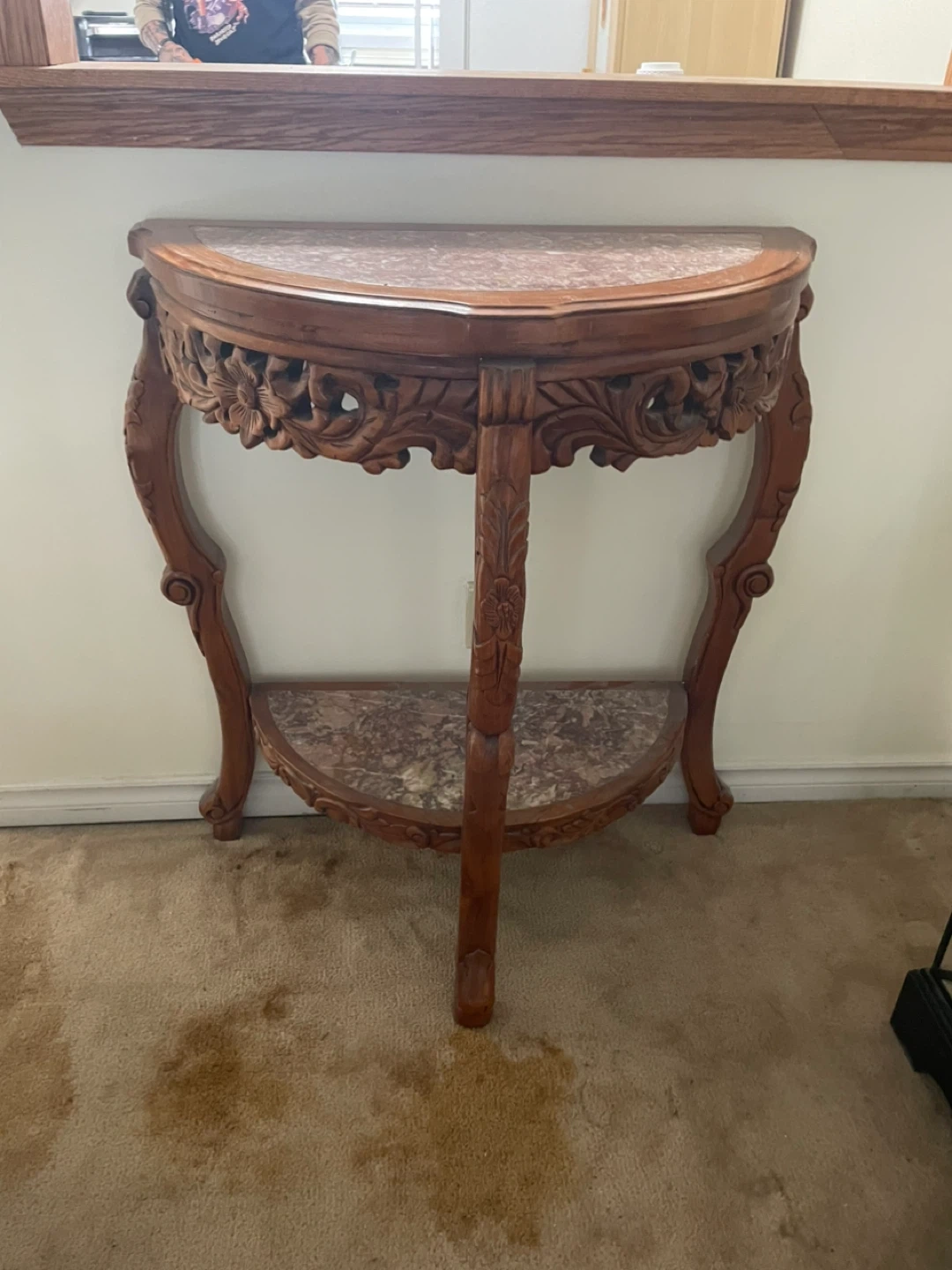Beautiful console table featuring intricate carved wood details and marble accents on the top and shelf. This half-moon table adds an elegant touch to any entryway or hallway. Wood and marble construction.