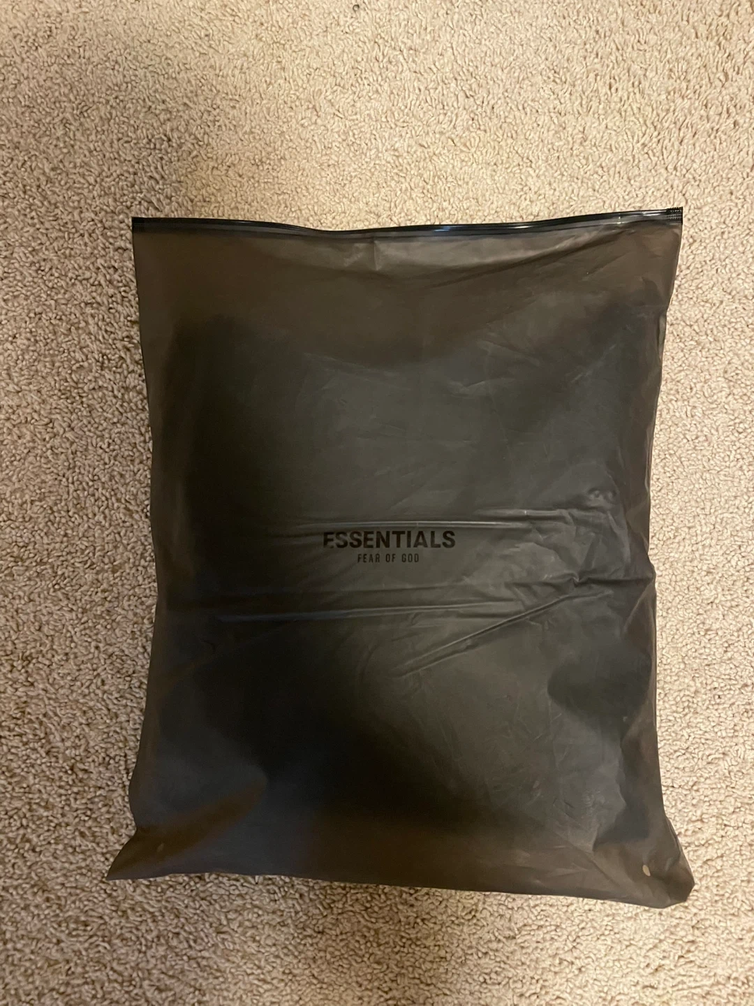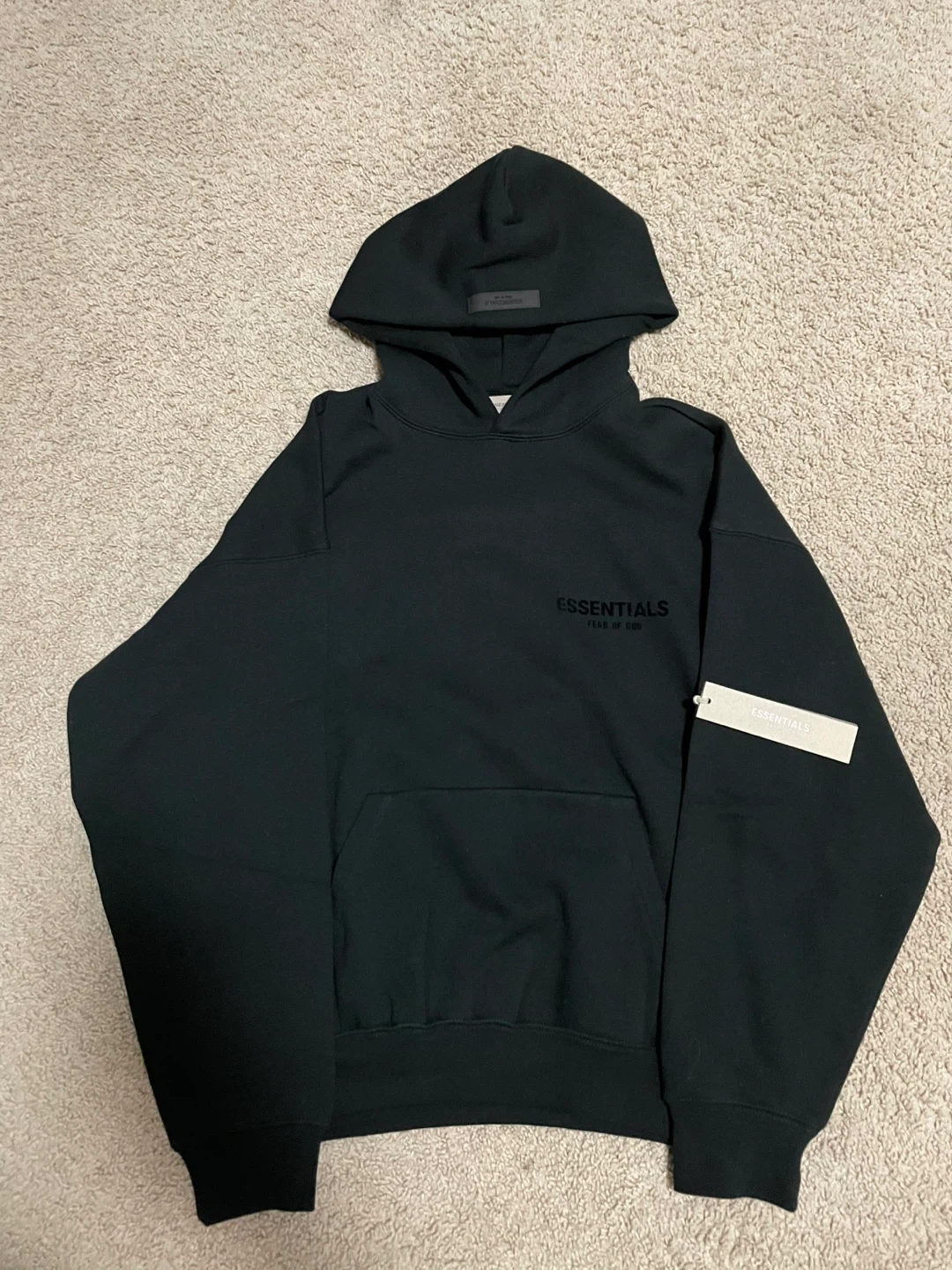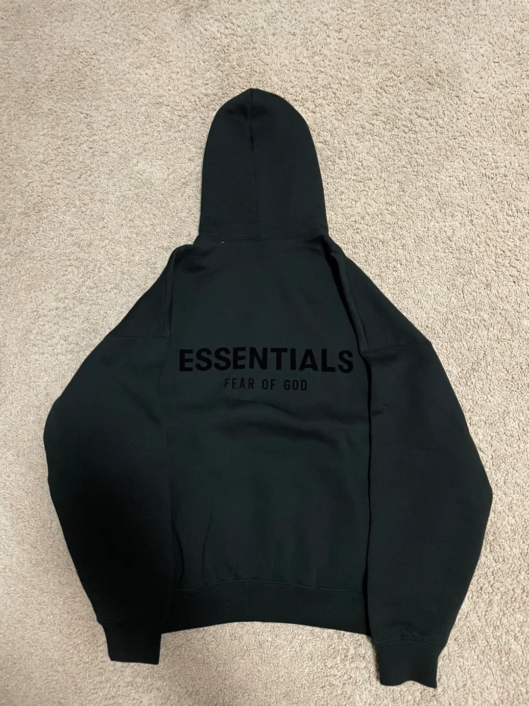 Black Fear of God ESSENTIALS hoodie. Includes original packaging and tag. Cotton blend material.