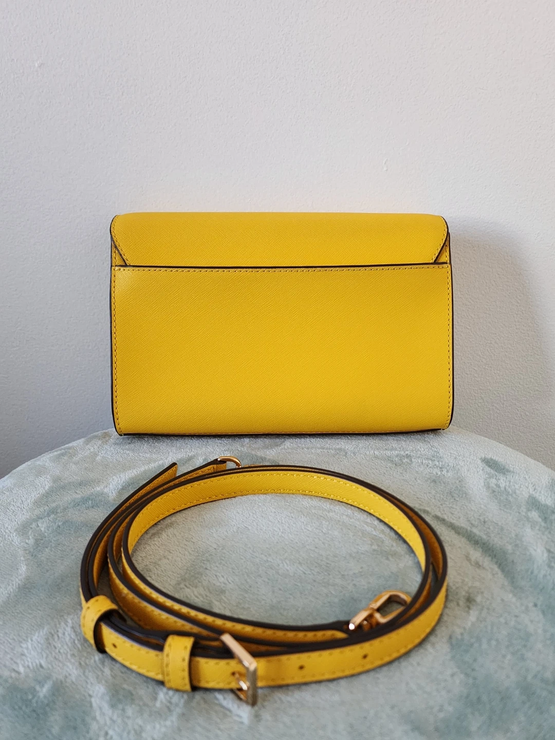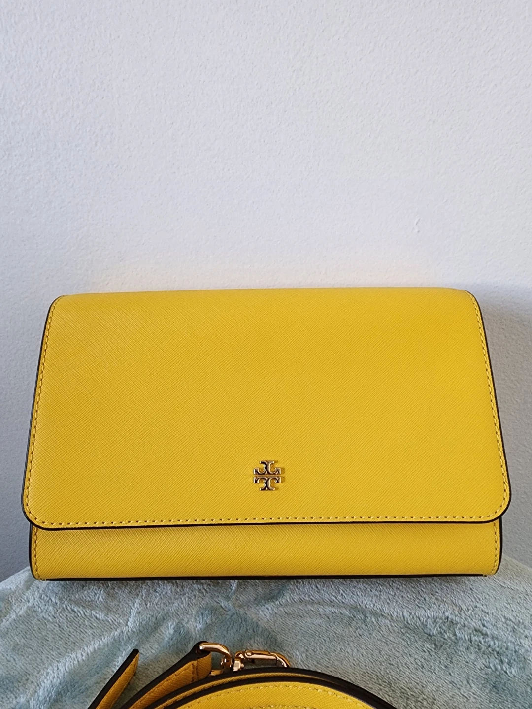 The Tory Burch Emerson chain wallet in lemon drop is a versatile accessory that will work well on the casual date as well as the formal work event; with denim, summer frocks, pencil skirts, and dress pants equally well. Saffiano Leather in a cross-hatch pattern, with gold hardware. Flap with magnetic closure. Removable chain with leather crossbody strap. 1 Slip Pocket on Back. Size : 19 x 3 x 12 cm. 1 Zip Pocket. 16 Card Slots. 2 Slip Pocket.