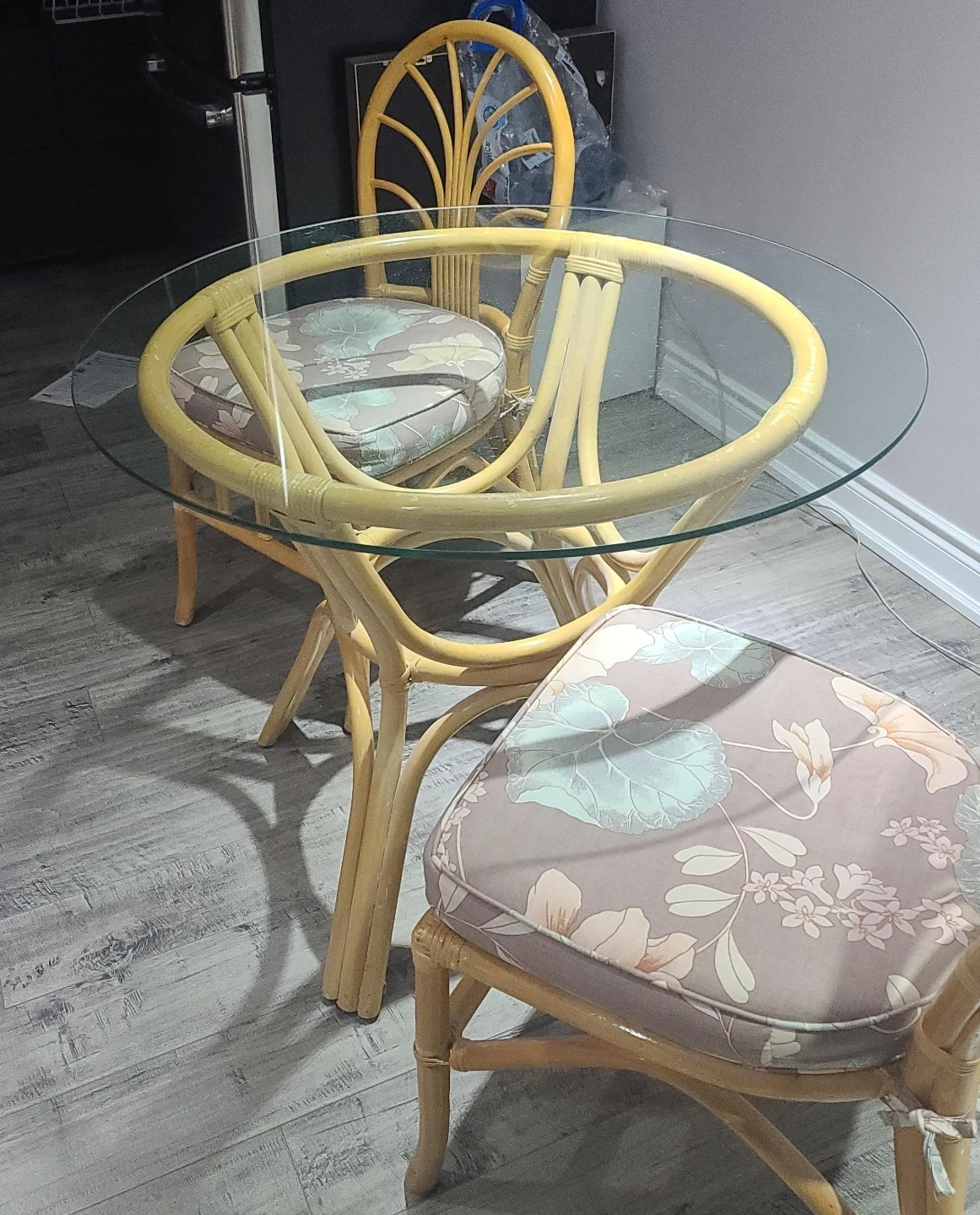 This charming set includes a round glass-top table with a rattan base and two matching chairs. The chairs feature floral print cushions for added comfort. It's a stylish and compact dining solution.