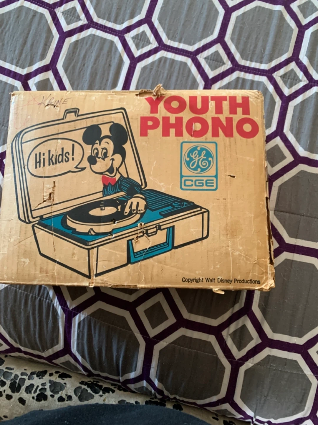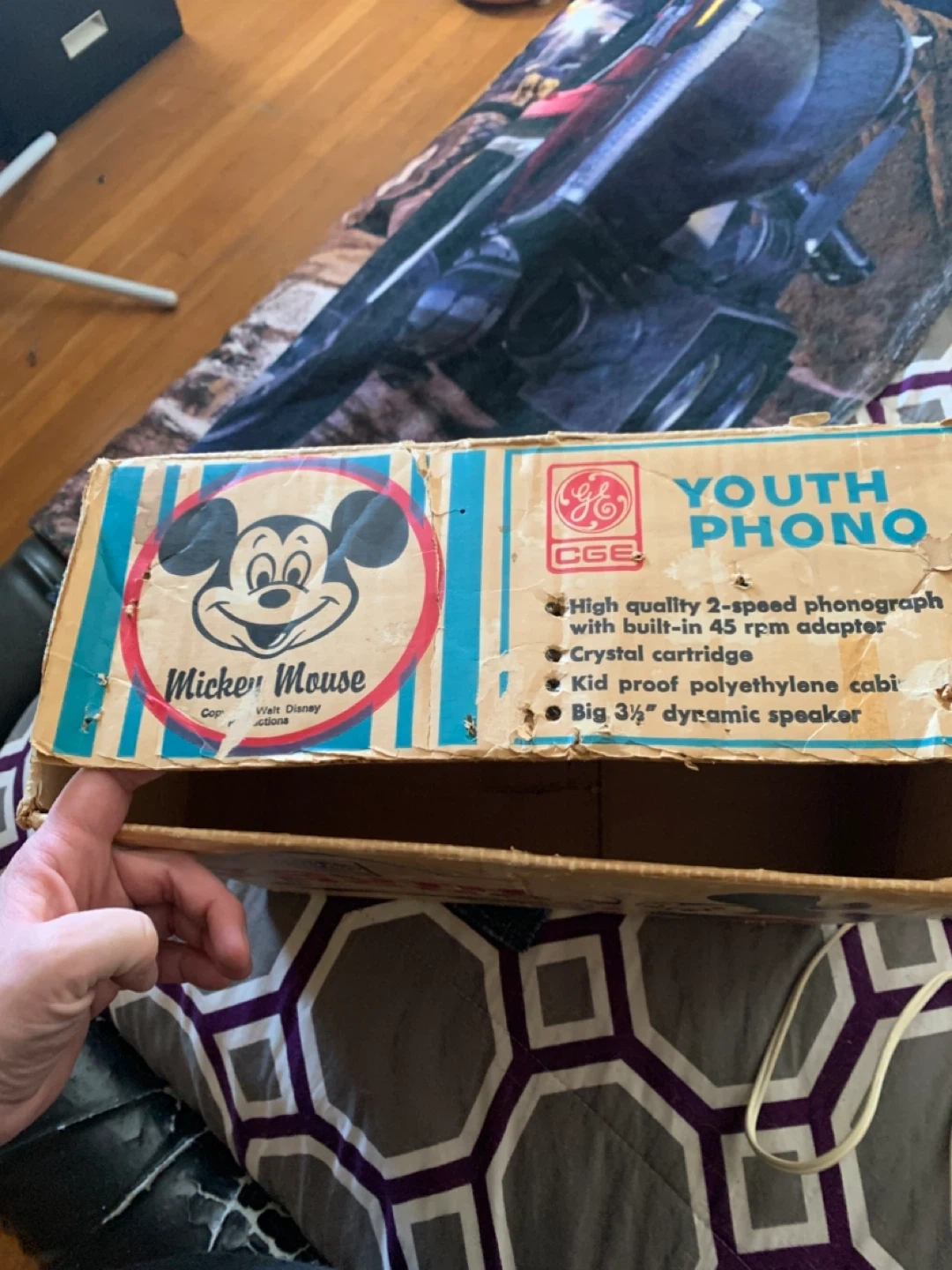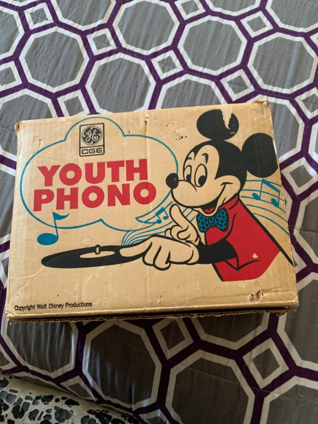 This is a vintage General Electric Youth Phono record player featuring Mickey Mouse. It's in its original box and includes the player and power cord. This portable turntable is a fun way for kids to listen to records!