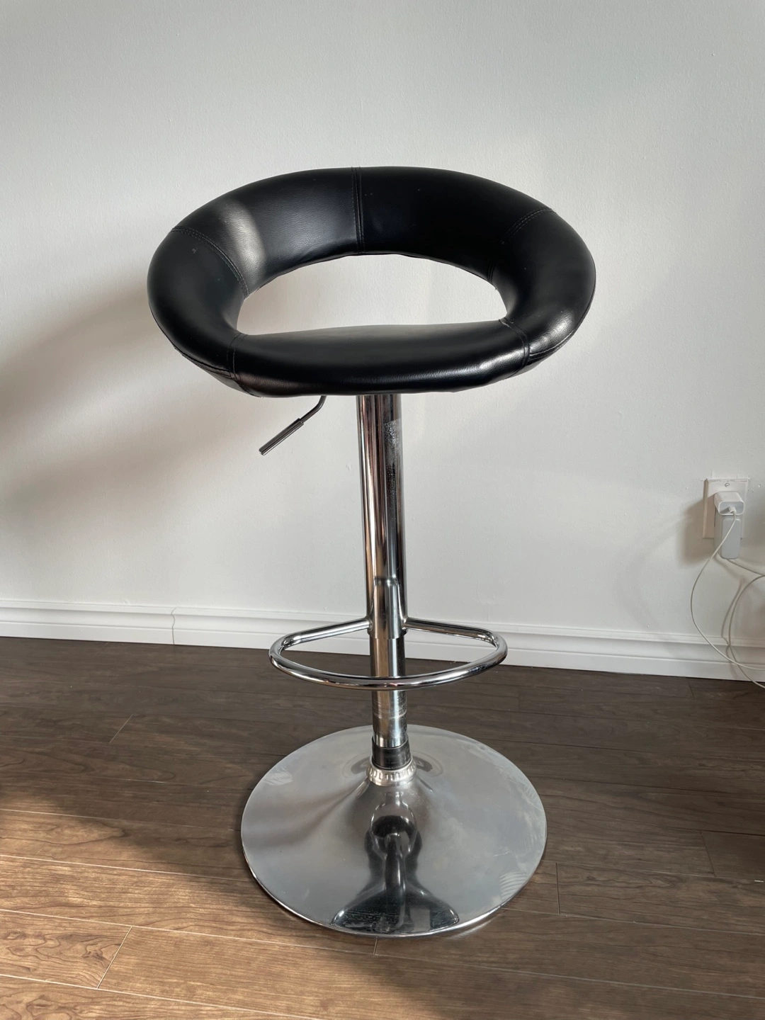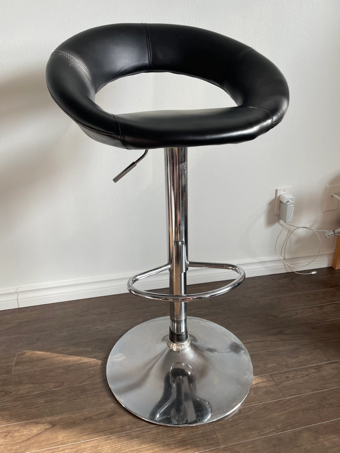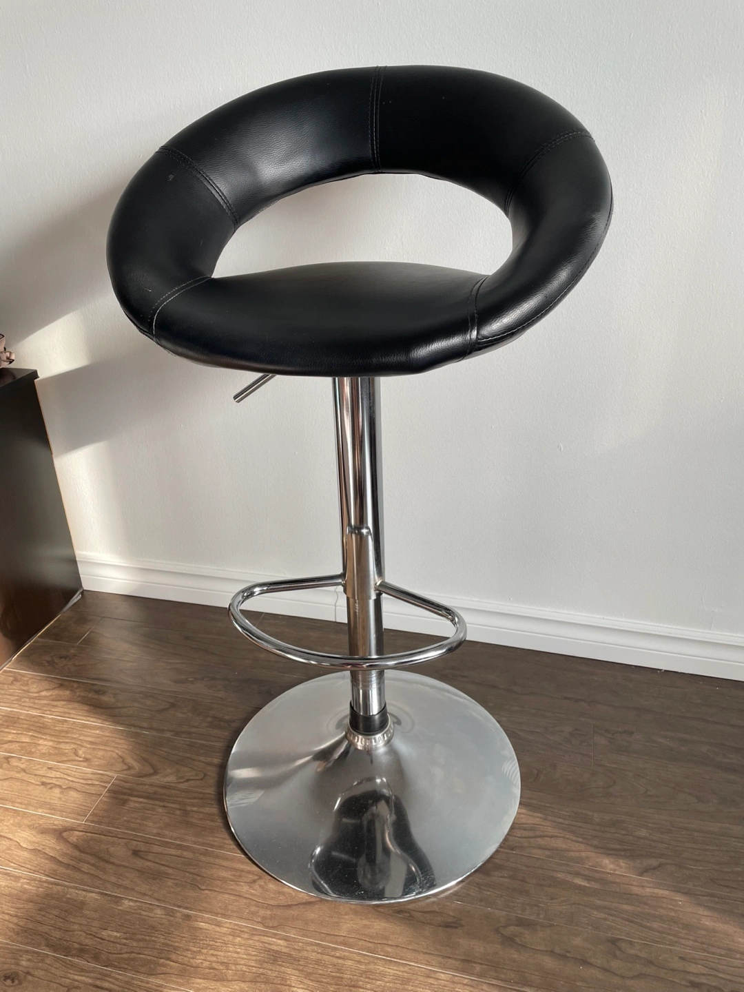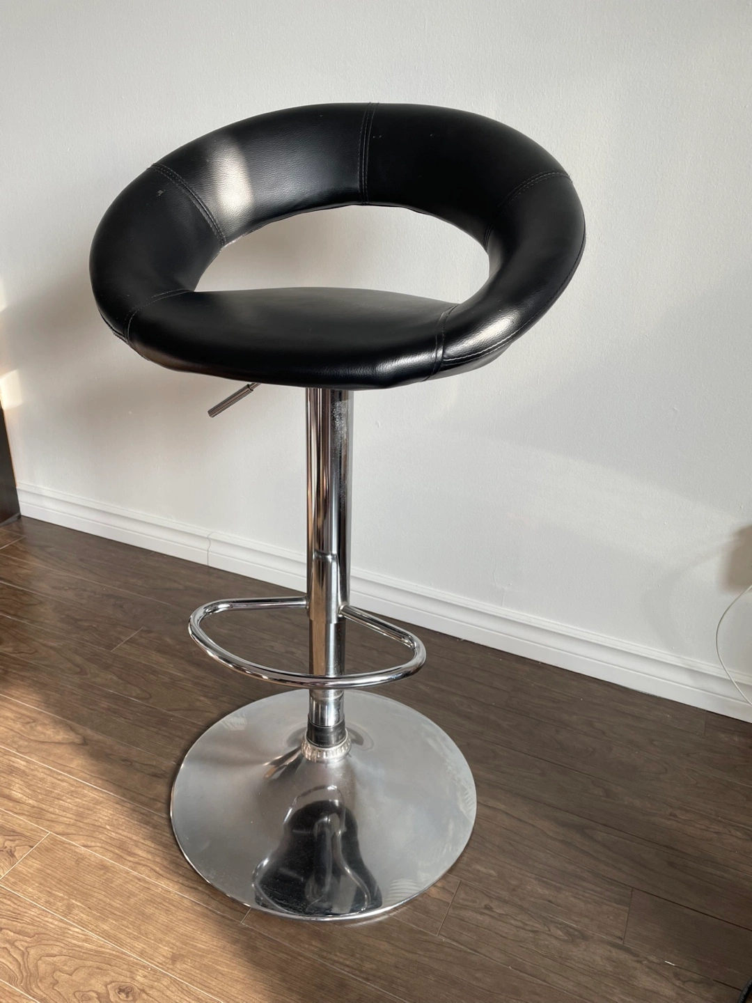 Here's a sleek black bar stool with a chrome base! It's adjustable, so you can set it to the perfect height for your counter or bar. The seat is comfy and stylish, perfect for adding a modern touch to your space
