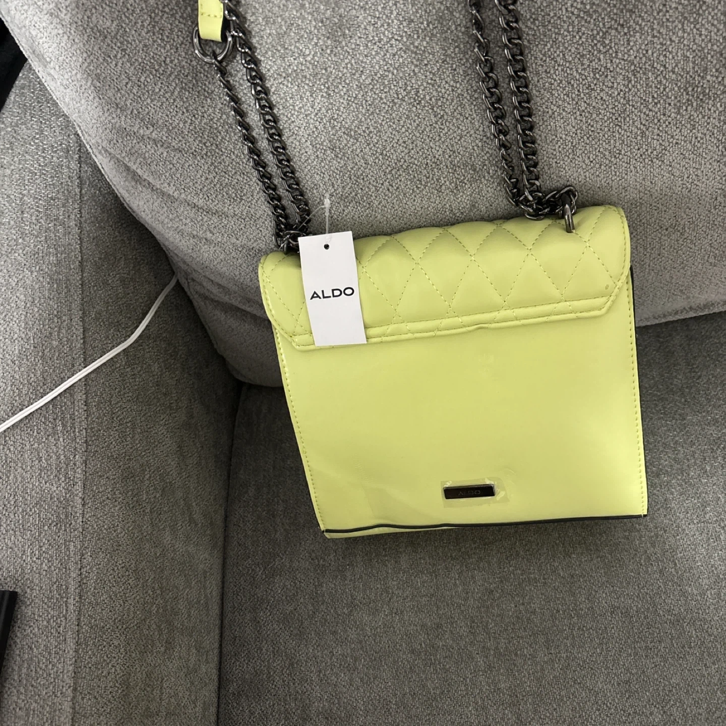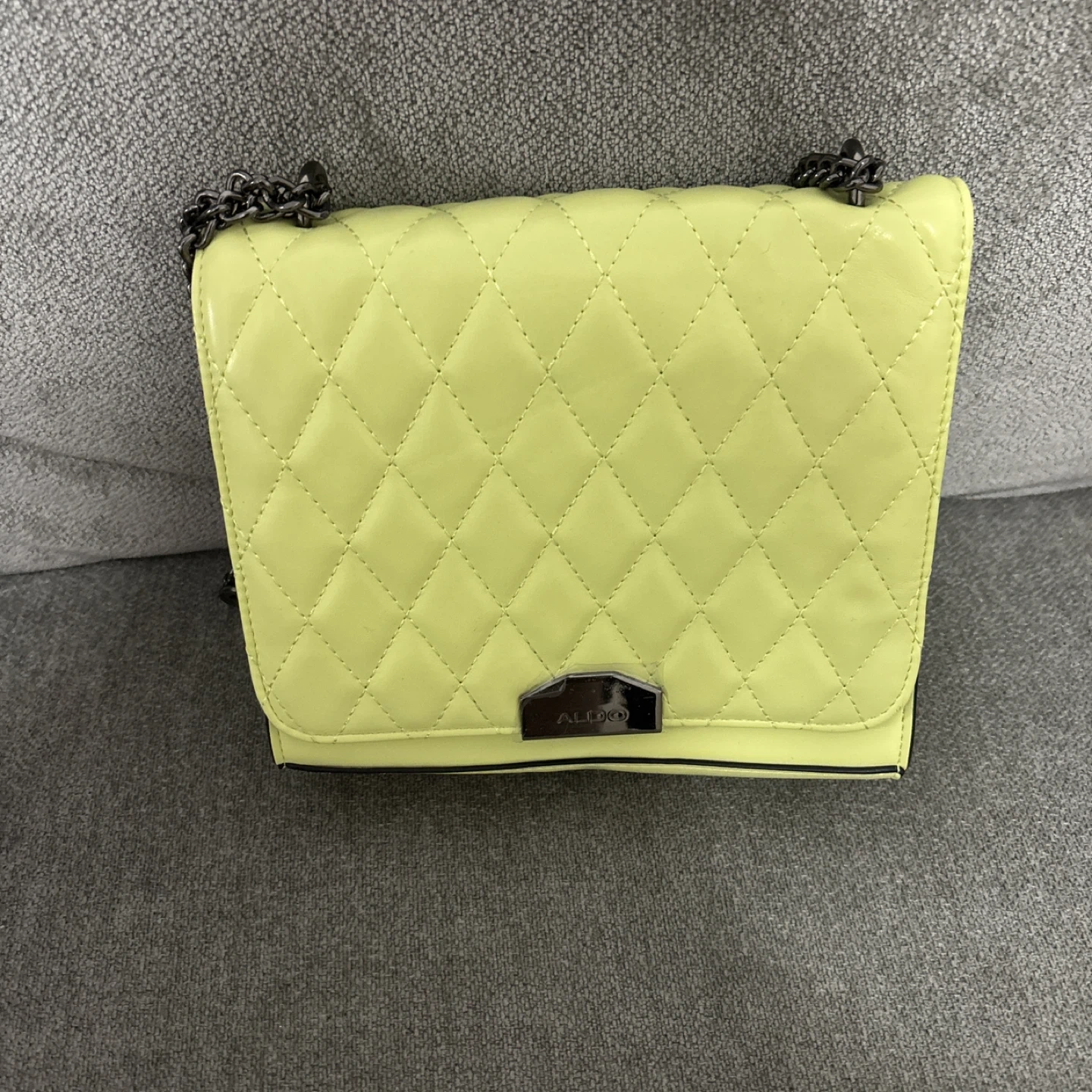 This ALDO crossbody bag features a stylish quilted design in a vibrant neon yellow. It comes with a dark metal chain strap for shoulder or crossbody wear. Bag material is patent faux leather.