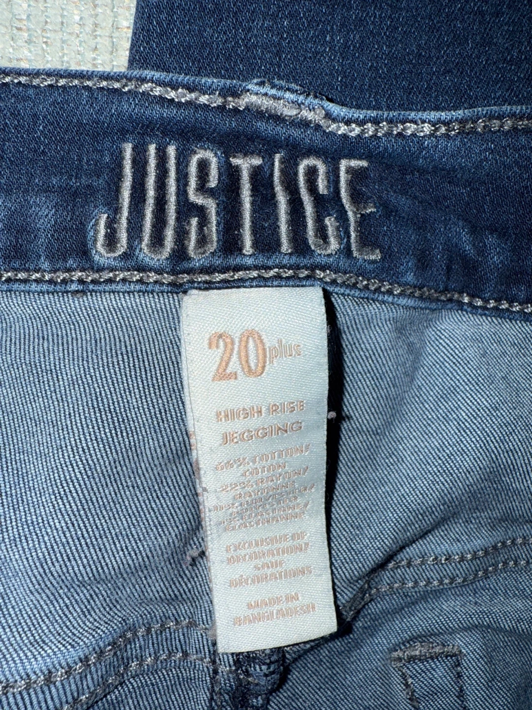 Justice "20 Plus" high rise jegging jeans. Made with 66% cotton, 29% rayon, and 5% polyester. These jeans offer a comfortable stretch fit. Great for everyday wear!