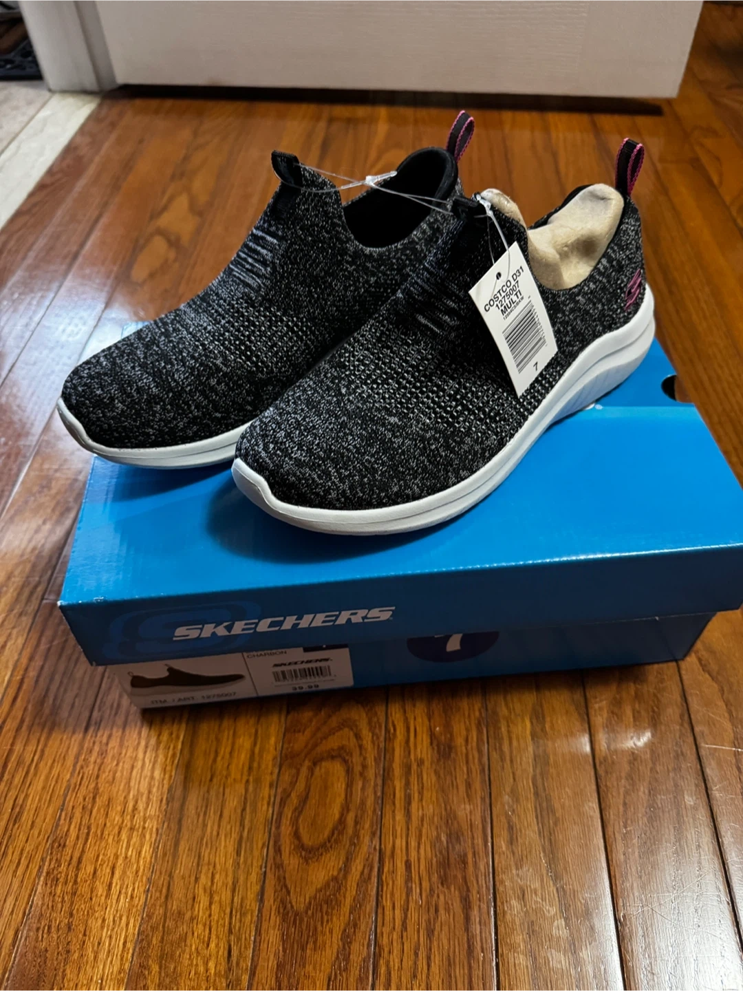 These are Skechers women's slip-on sneakers in charcoal. They are a size 7. The shoes are made with a breathable knit material and feature a cushioned insole. They're great for everyday wear or light exercise.