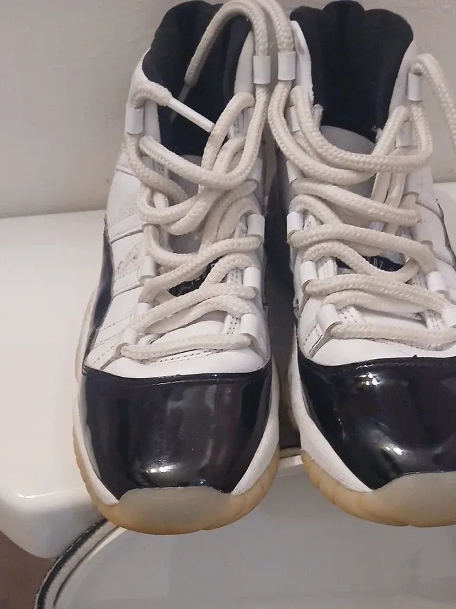Iconic Air Jordan 11 Retro sneakers in the classic 'Concord' colorway. Features a white leather upper with black patent leather accents and icy translucent soles. High-top silhouette with white laces. These are a men's size.
